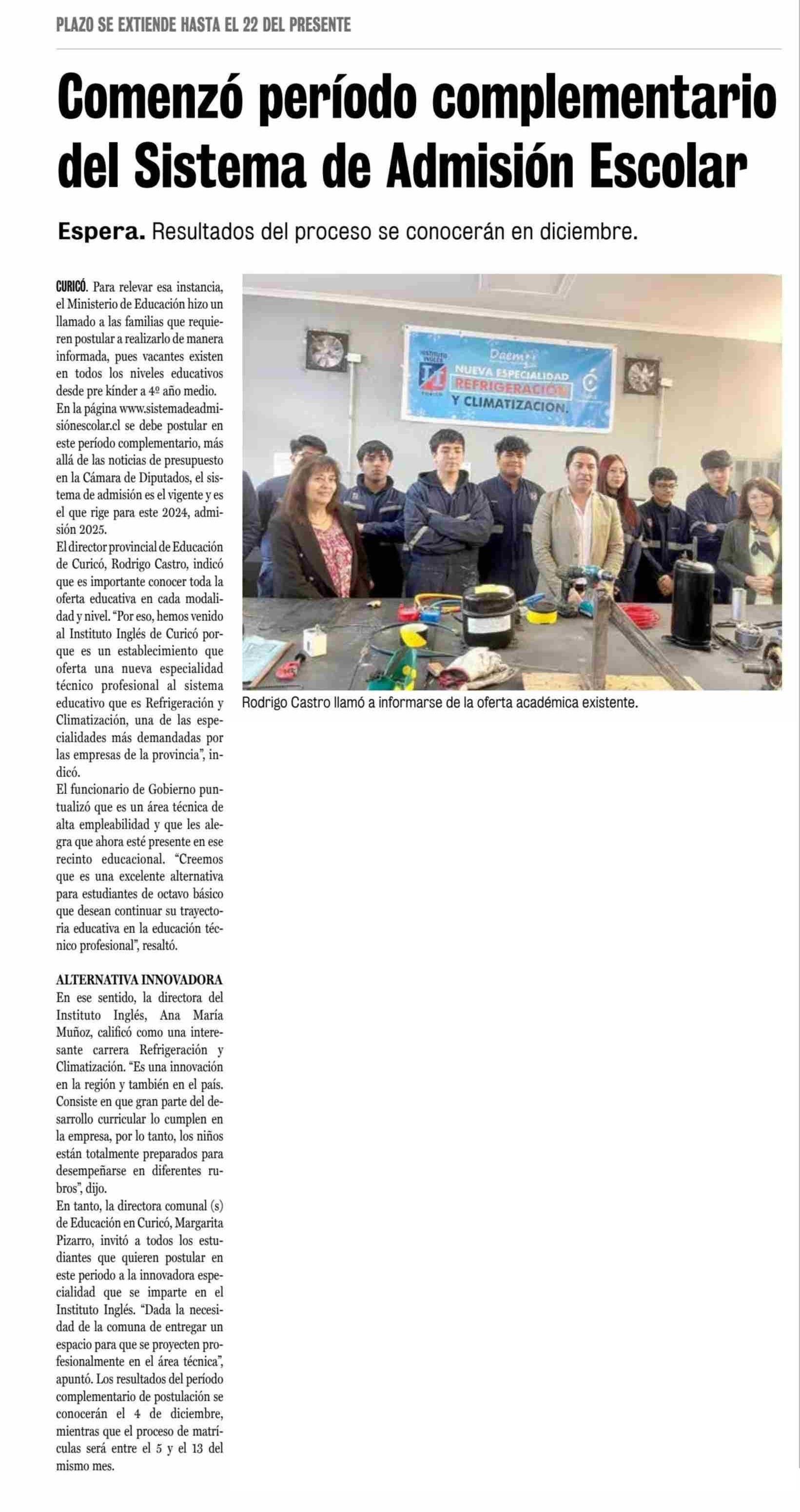 Comenzó período complementario del Sistema de Admisión Escolar 17-11-2024 La Prensa de Curicó |