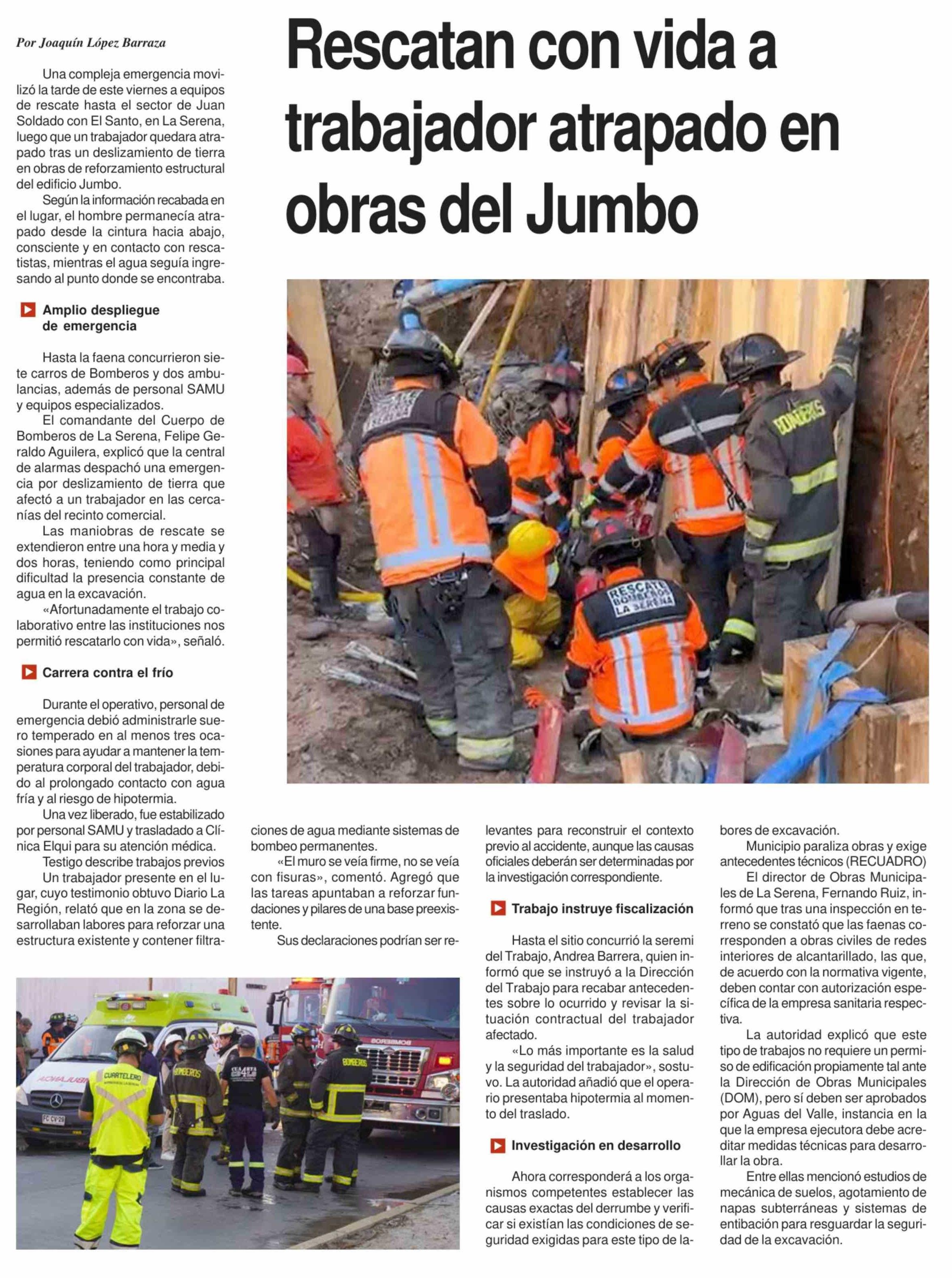 Rescatan con vida a trabajador atrapado en obras del Jumbo 25-04-2026 Diario la Región |