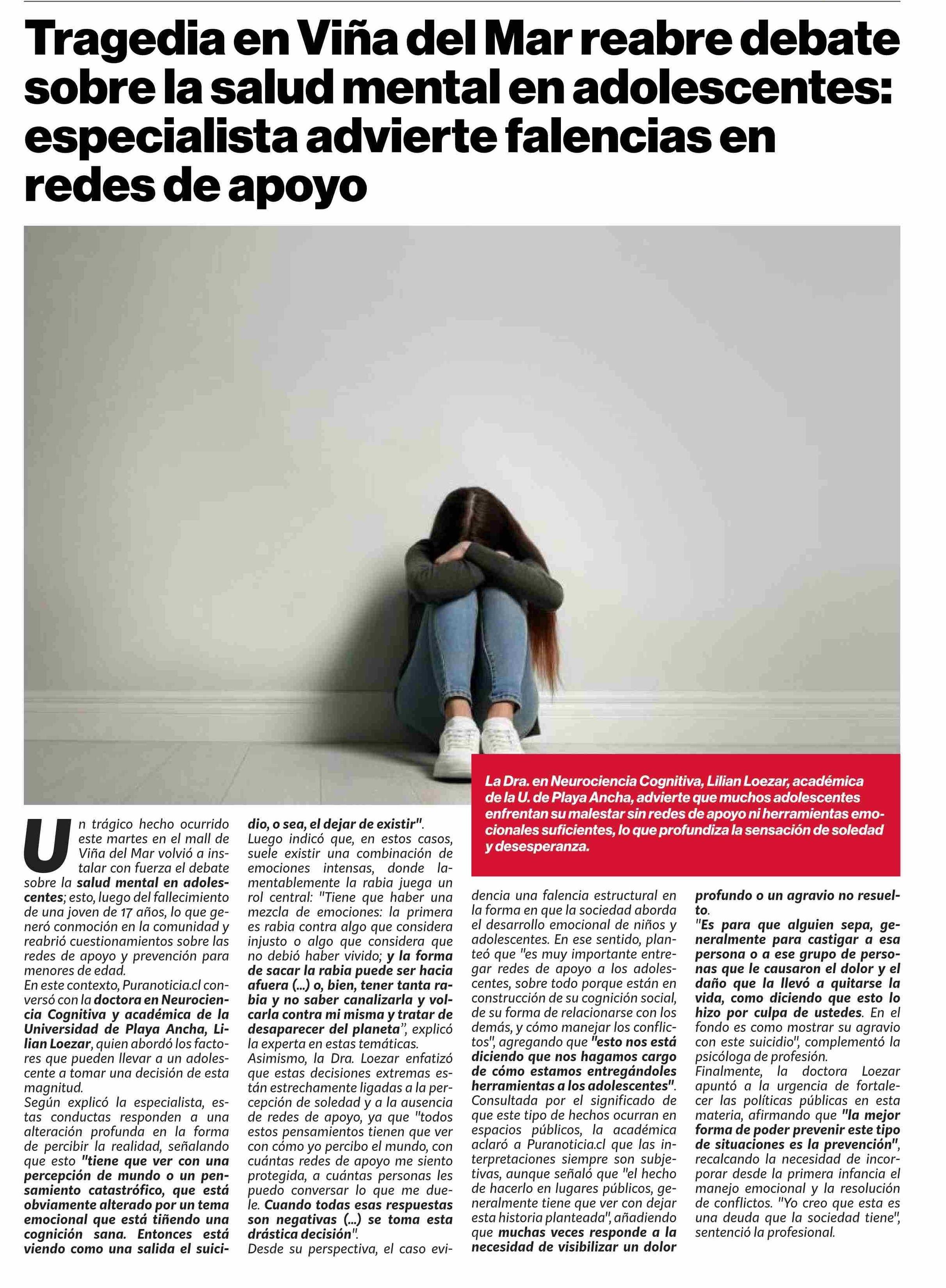 Tragedia en Viña del Mar reabre debate sobre la salud mental en adolescentes: especialista advierte falencias en redes de apoyo 29-01-2026 Puranoticia.cl |
