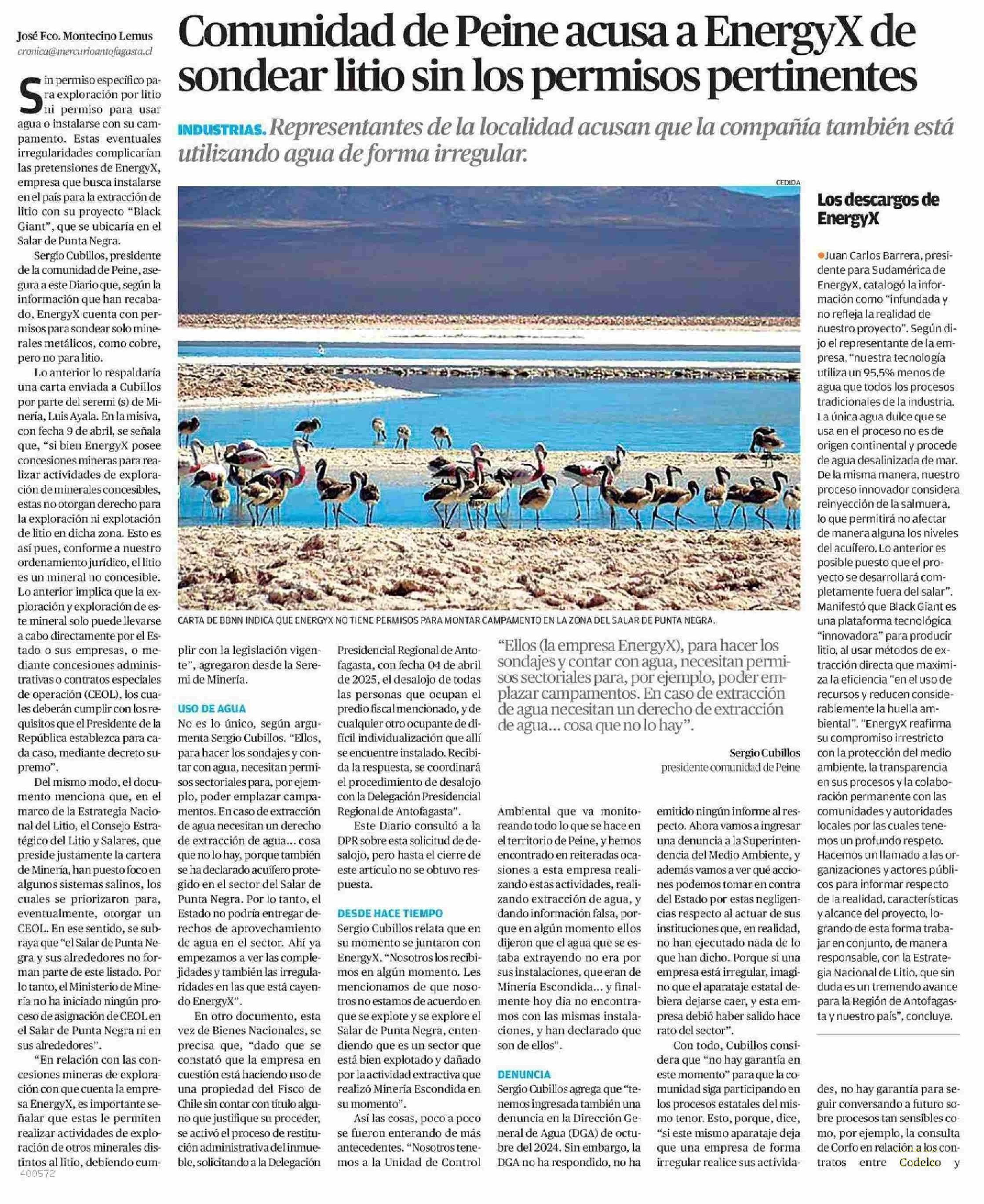 Comunidad de Peine acusa a EnergyX de sondear litio sin los permisos pertinentes 03-05-2025 El Mercurio de Antofagasta |