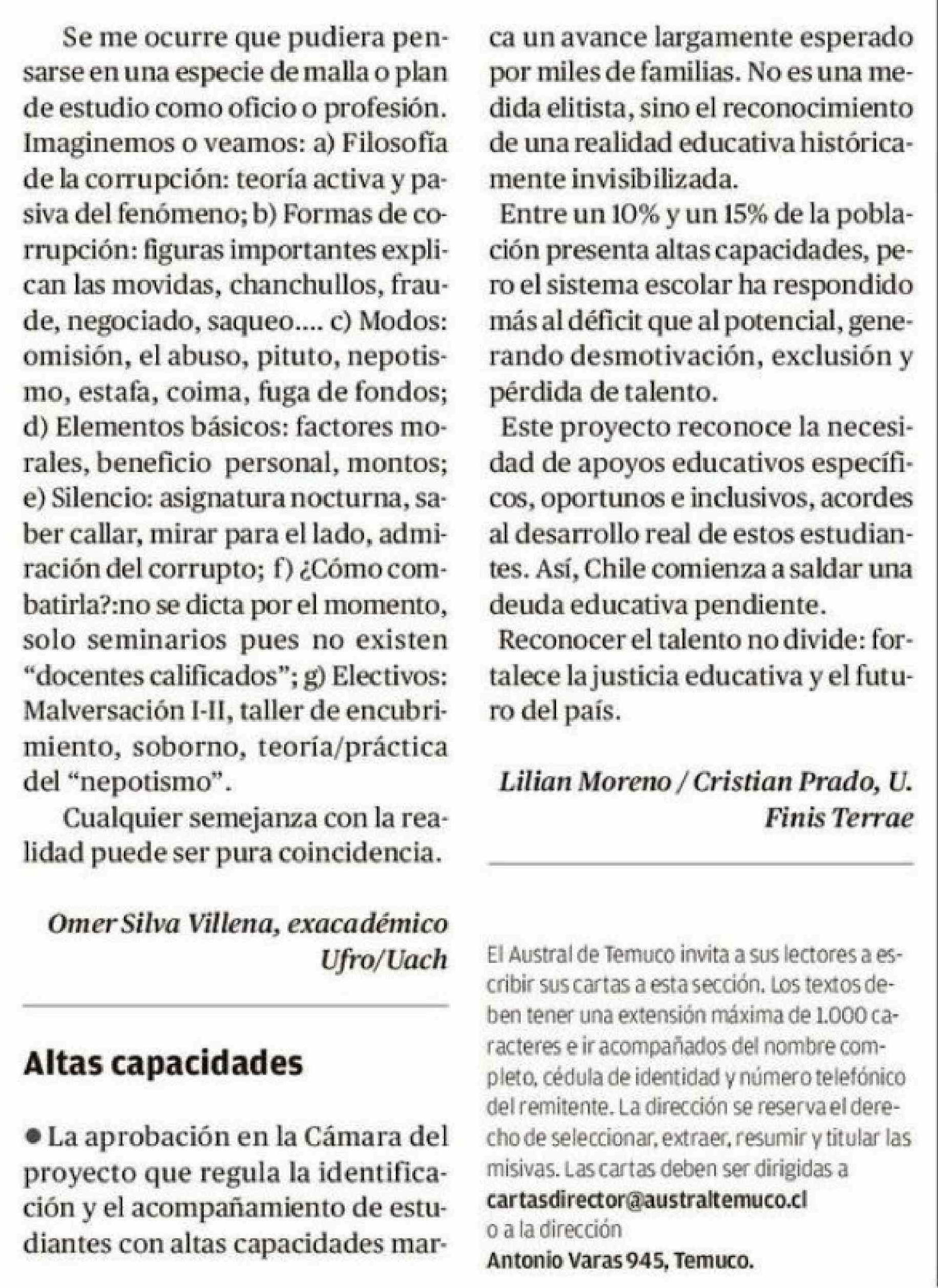Cartas: Altas capacidades 02-02-2026 El Austral de la Araucanía |