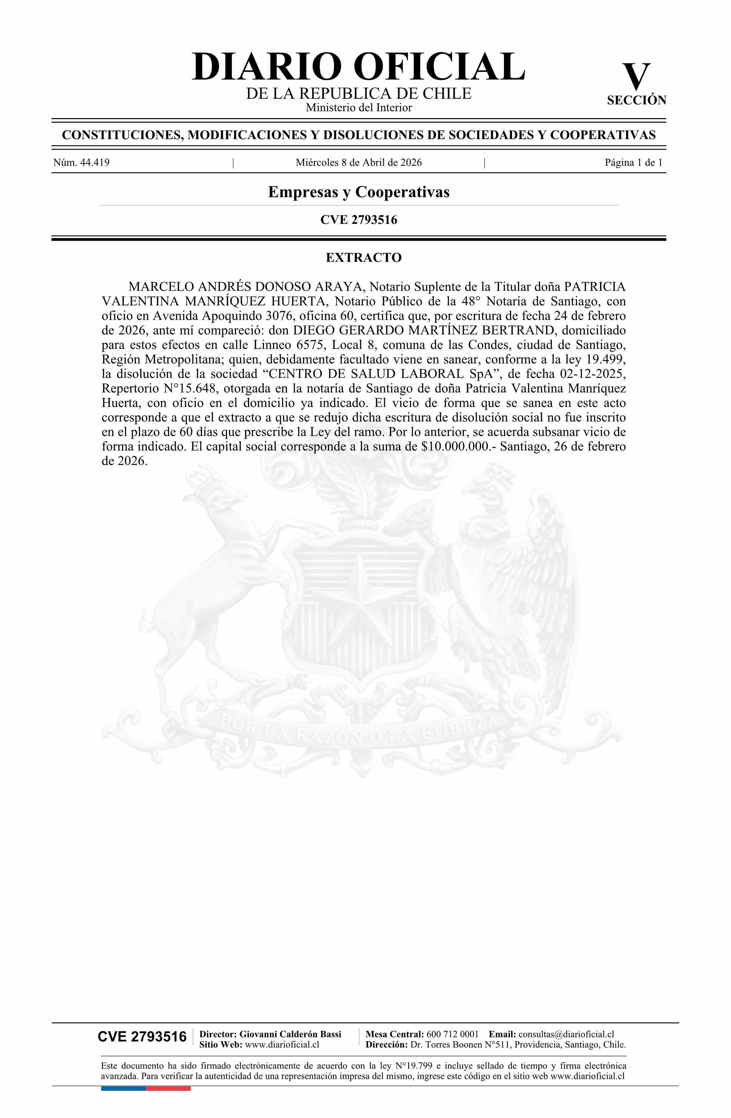 CENTRO DE SALUD LABORAL SpA 76.340.116-2 08-04-2026 Diario Oficial Edición Electrónica |