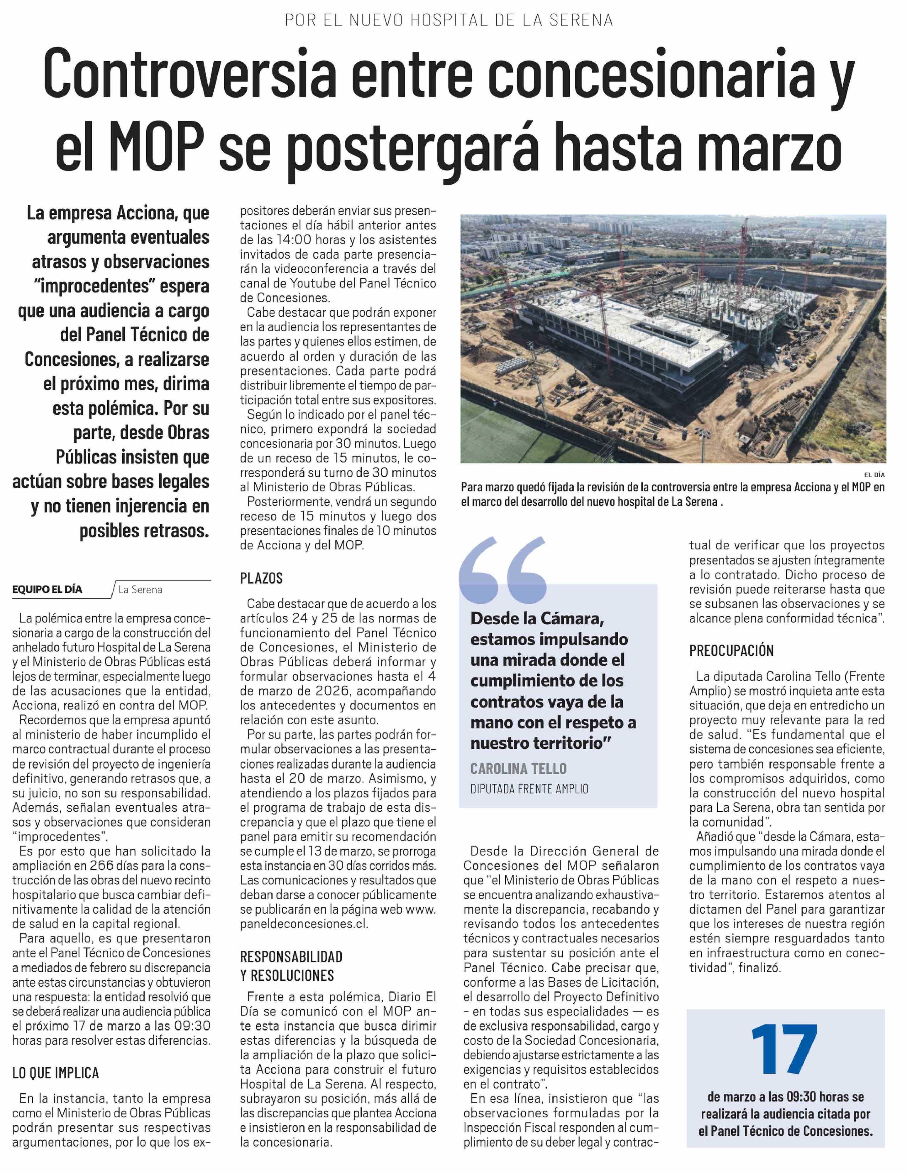 Controversia entre concesionaria y el MOP se postergará hasta marzo 23-02-2026 El Día |