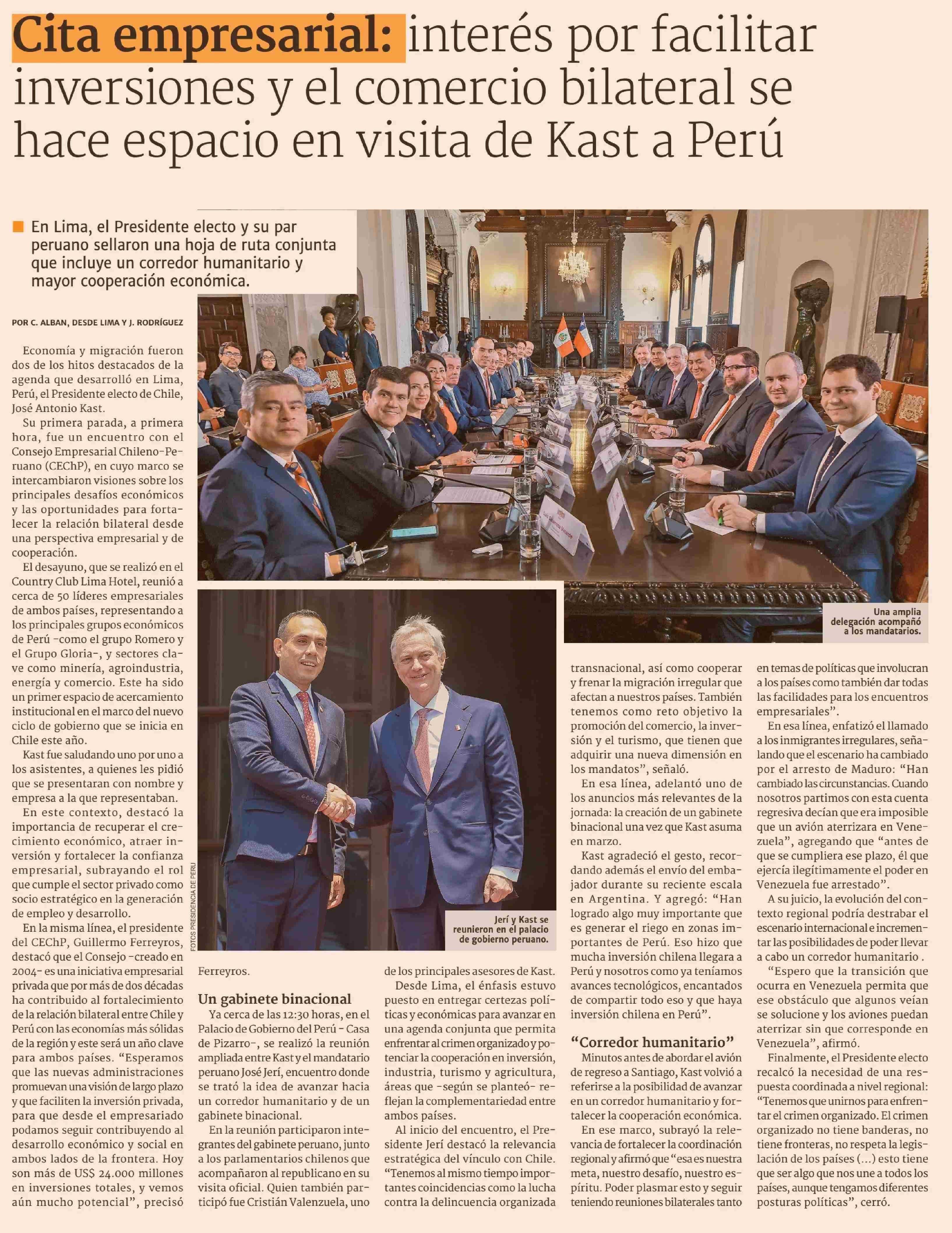 Título: Cita empresarial: interés por facilitar inversiones y el comercio bilateral se hace espacio en visita de Kast a Perú