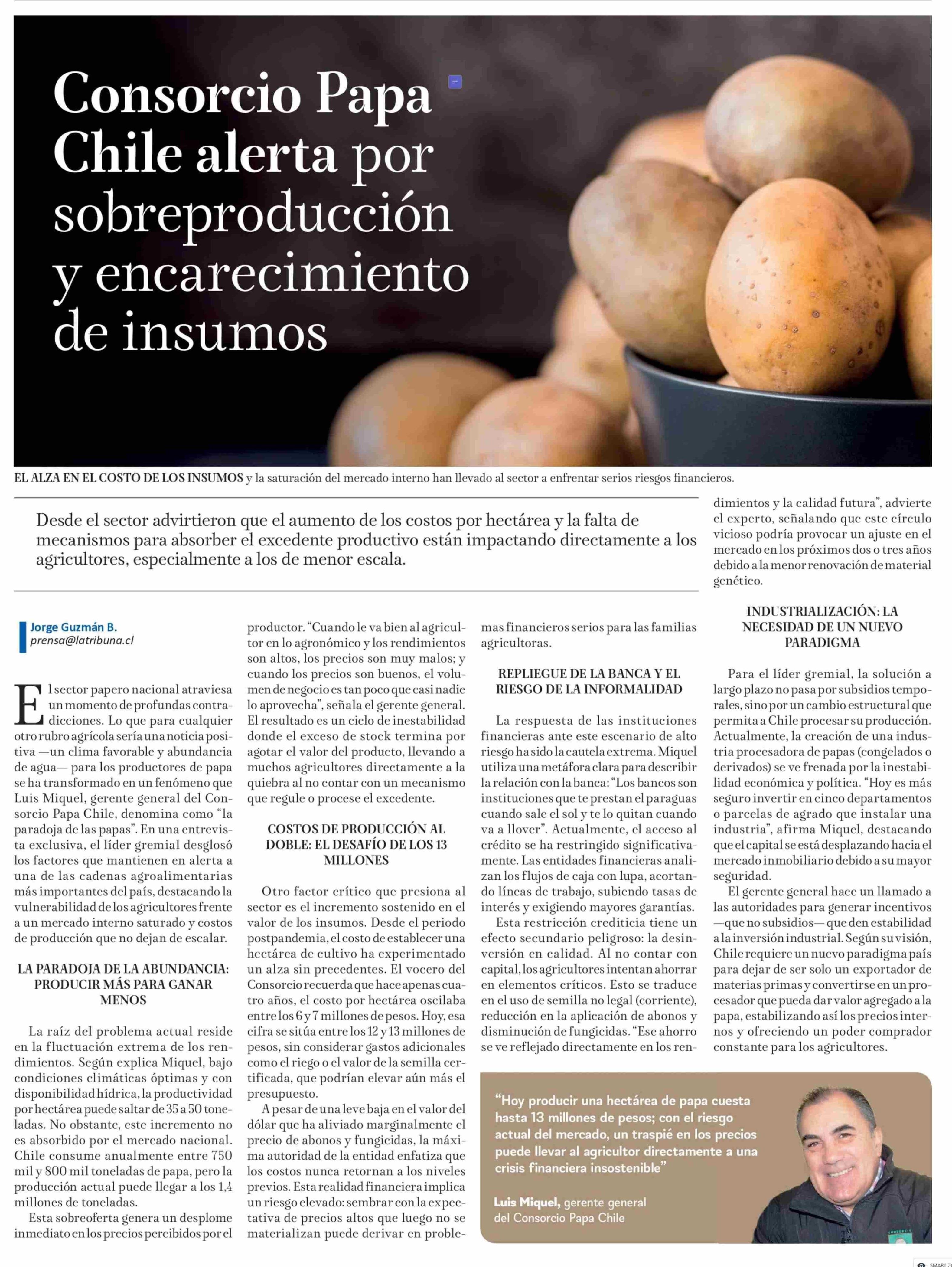 Consorcio Papa Chile alerta por sobreproducción y encarecimiento de insumos 10-01-2026 La Tribuna |