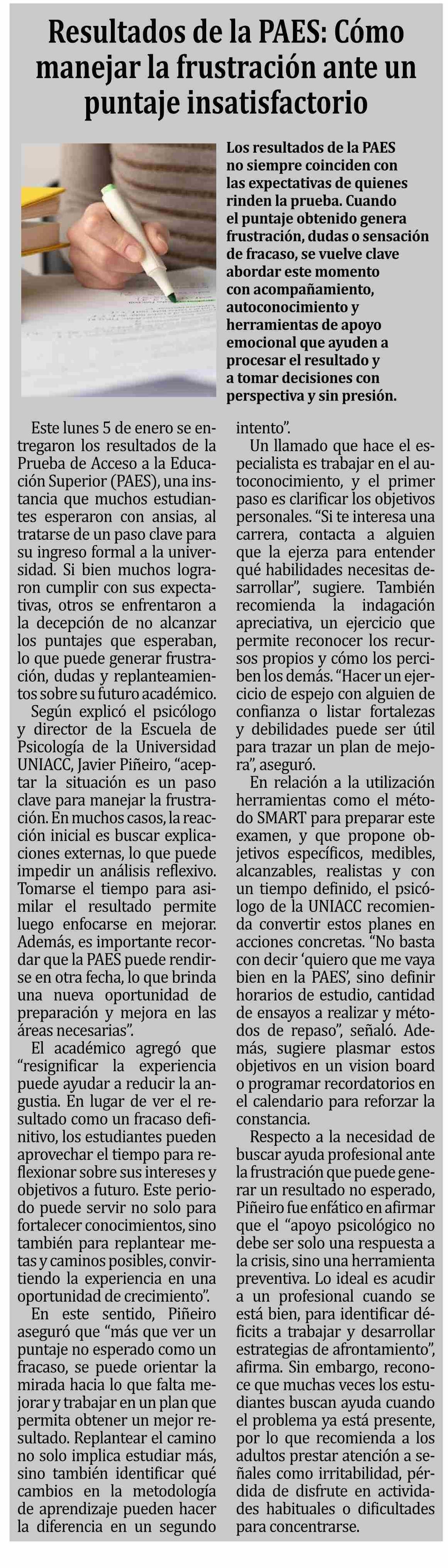 Título: Columnas de Opinión: Resultados de la PAES: Cómo manejar la frustración ante un puntaje insatisfactorio