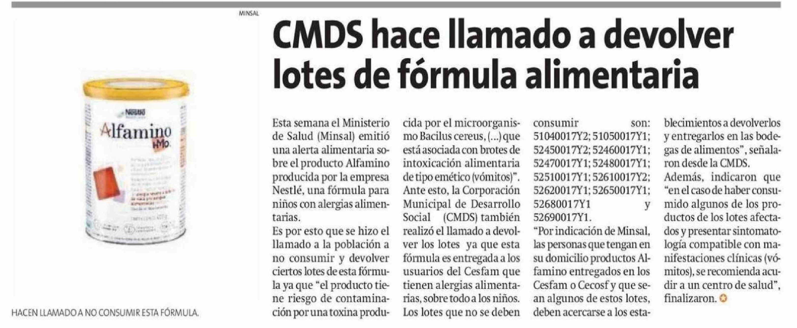 Título: CMDS hace llamado a devolver lotes de fórmula alimentaria