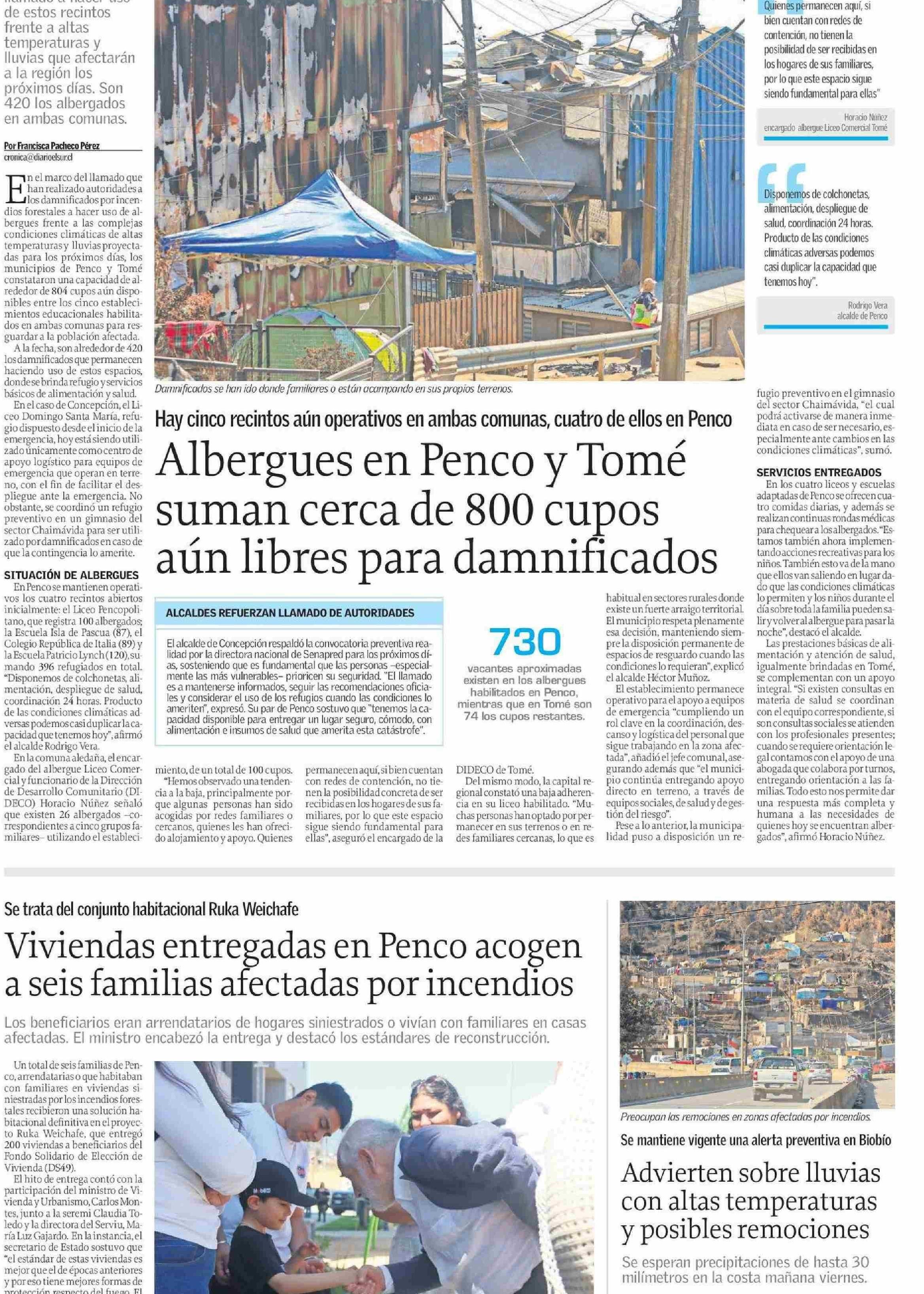 Albergues en Penco y Tomé suman cerca de 800 cupos aún libres para damnificados 29-01-2026 El Sur |