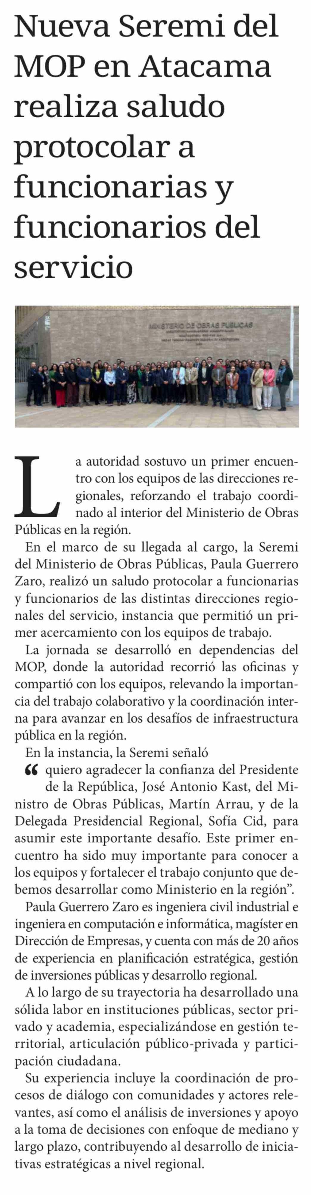 Título: Nueva Seremi del MOP en Atacama realiza saludo protocolar a funcionarias y funcionarios del servicio