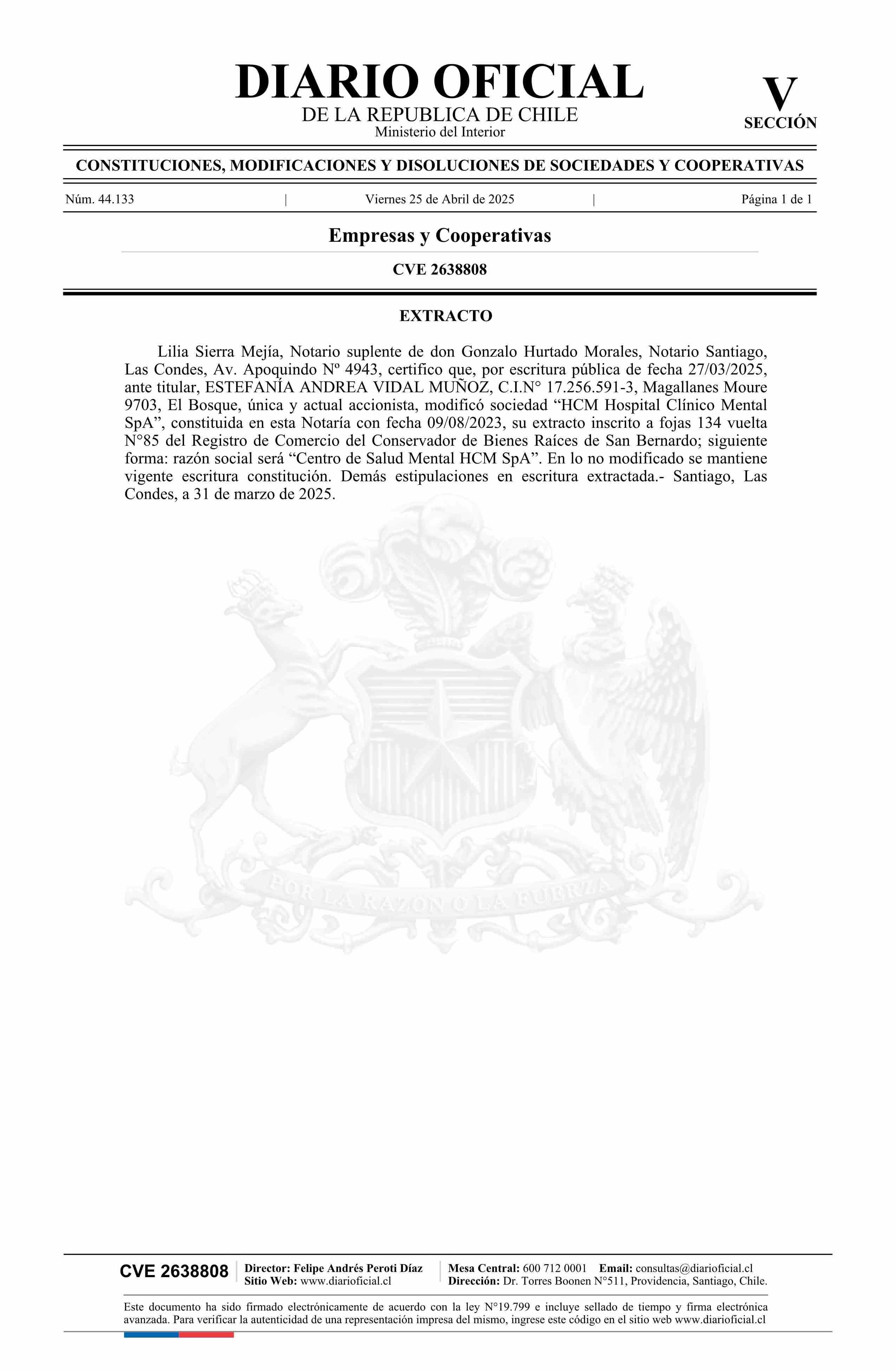 CENTRO DE SALUD MENTAL HCM SpA 77.818.628-4* 25-04-2025 Diario Oficial Edición Electrónica |