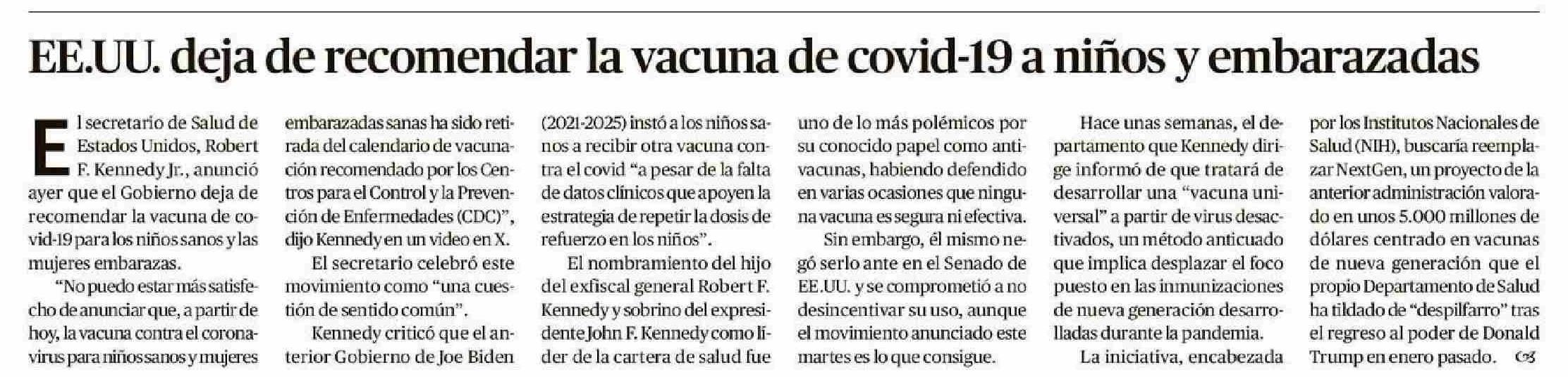 | Título: | EE.UU. deja de recomendar la vacuna de covid-19 a niños y embarazadas |