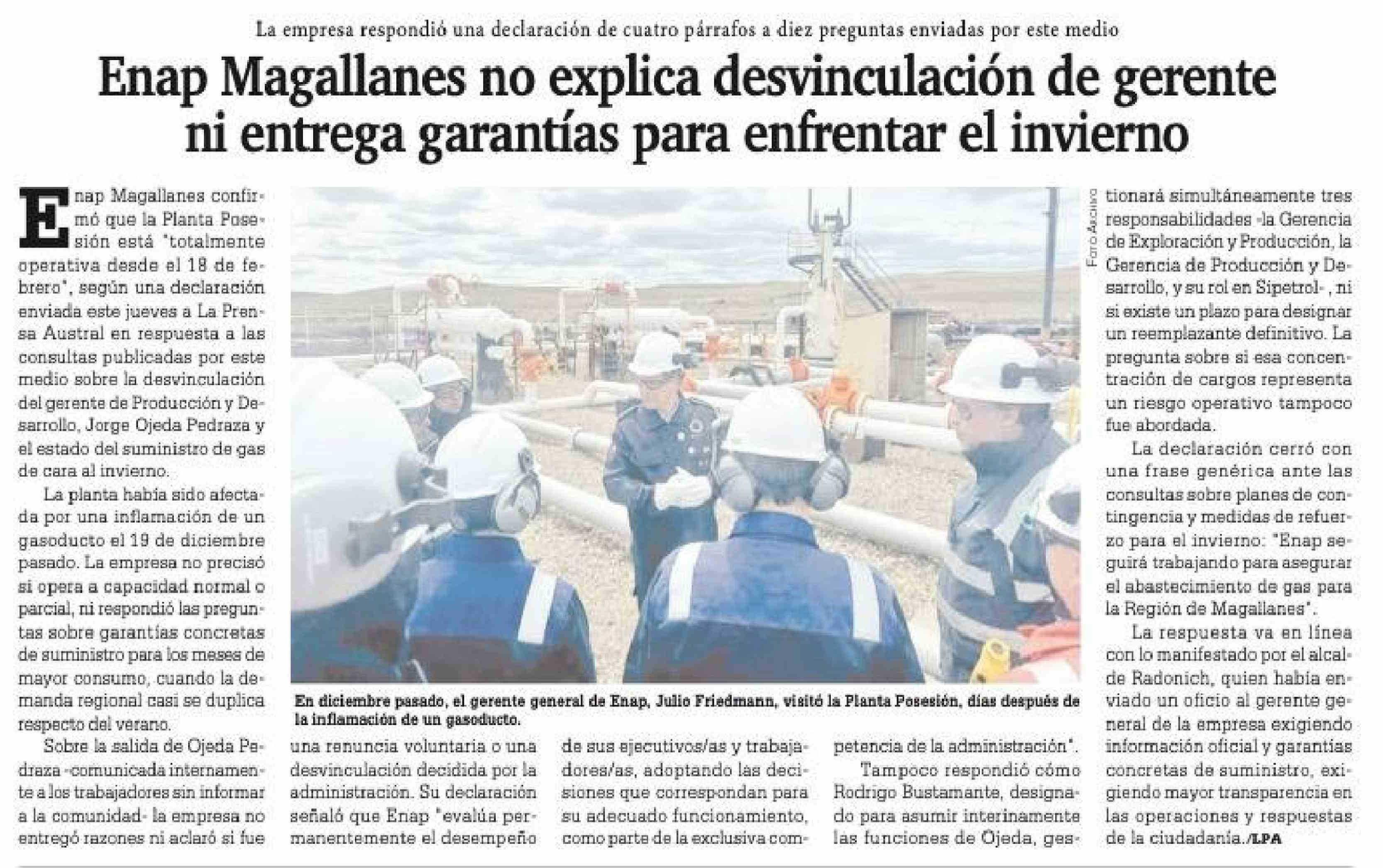 | Título: | Enap Magallanes no explica desvinculación de gerente ni entrega garantías para enfrentar el invierno |