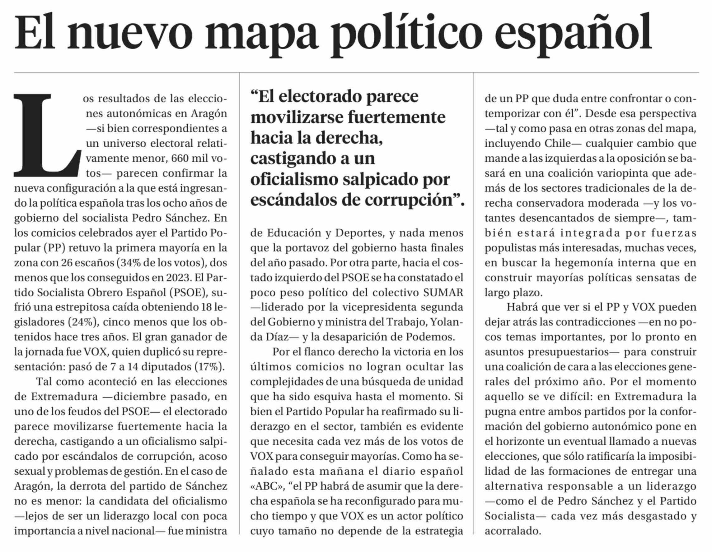 Editorial: El nuevo mapa político español 09-02-2026 La Segunda |