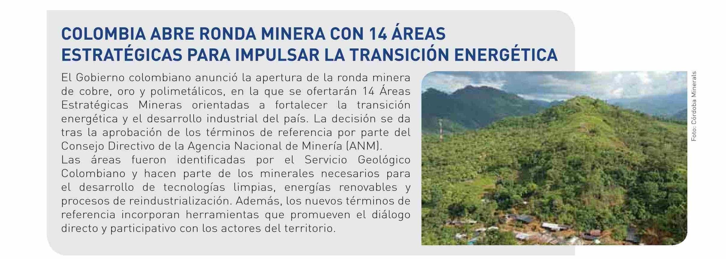 | Título: | COLOMBIA ABRE RONDA MINERA CON 14 ÁREAS ESTRATÉGICAS PARA IMPULSAR LA TRANSICIÓN ENERGÉTICA |