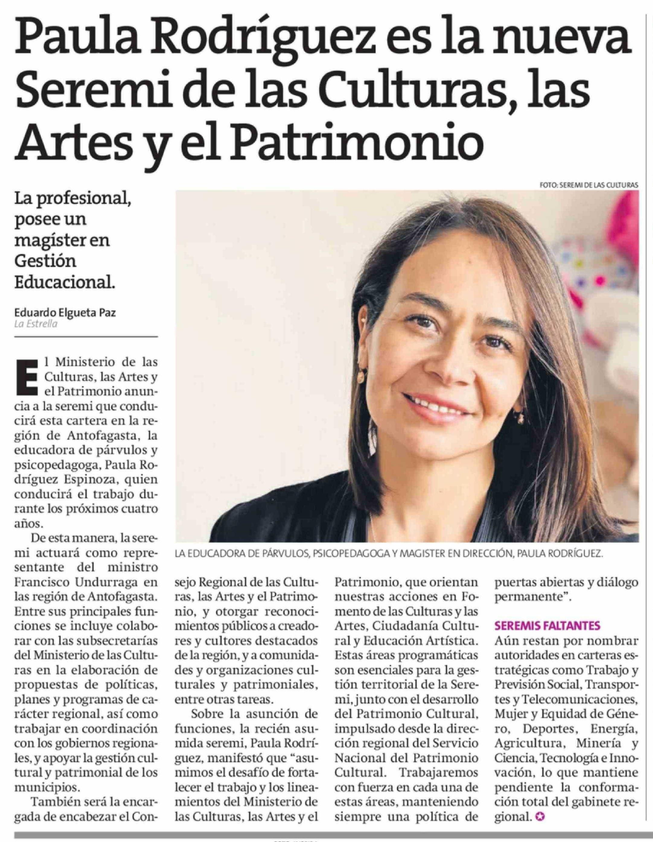 Paula Rodríguez es la nueva Seremi de las Culturas, las Artes y el Patrimonio 31-03-2026 La Estrella de Antofagasta |