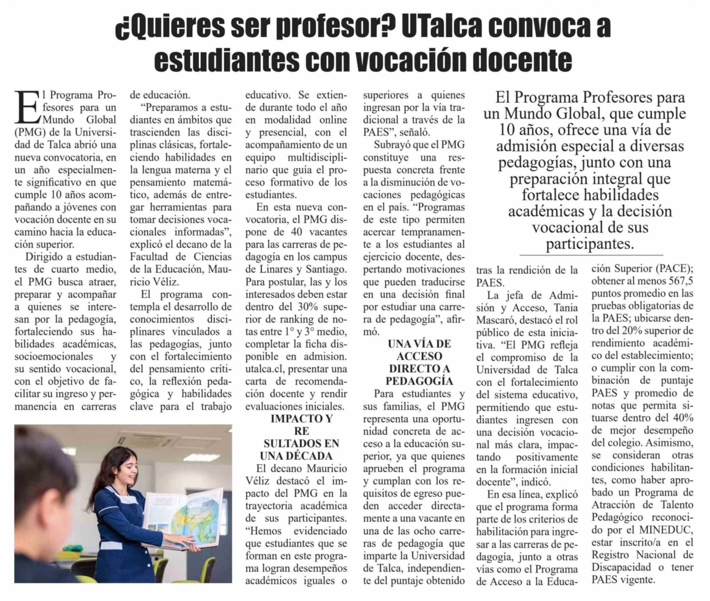 ¿Quieres ser profesor? UTalca convoca a estudiantes con vocación docente 12-04-2026 El Heraldo |
