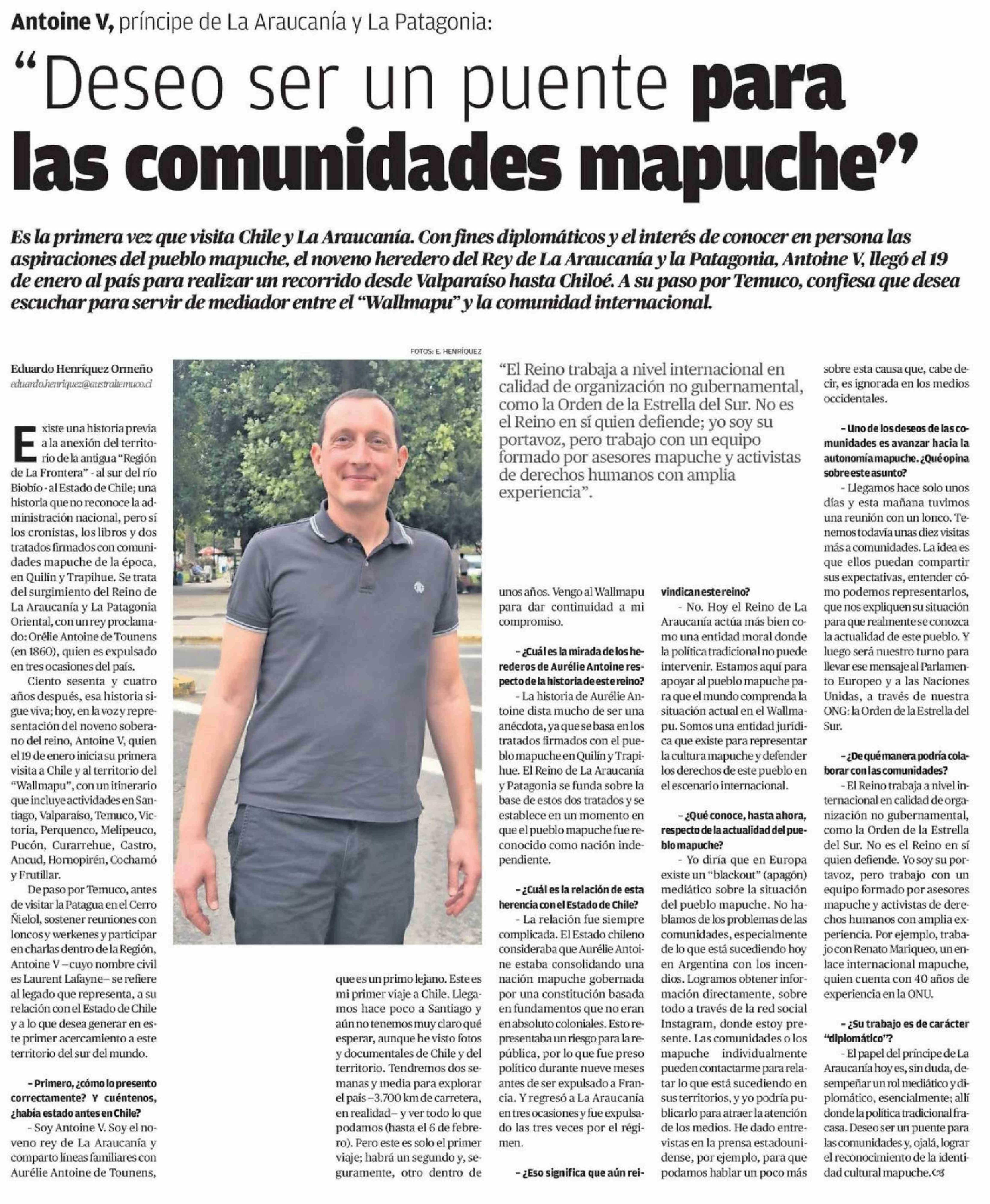 "Deseo ser un puente para las comunidades mapuche" 01-02-2026 El Austral de la Araucanía |
