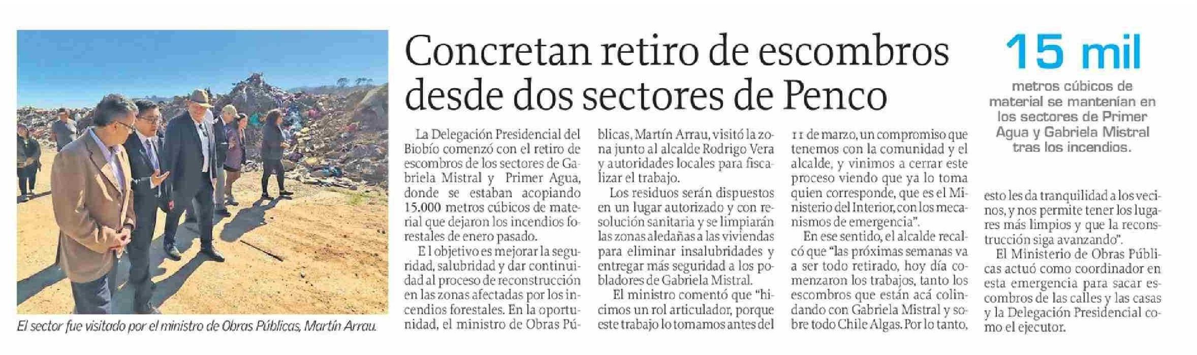| Título: | Concretan retiro de escombros desde dos sectores de Penco |