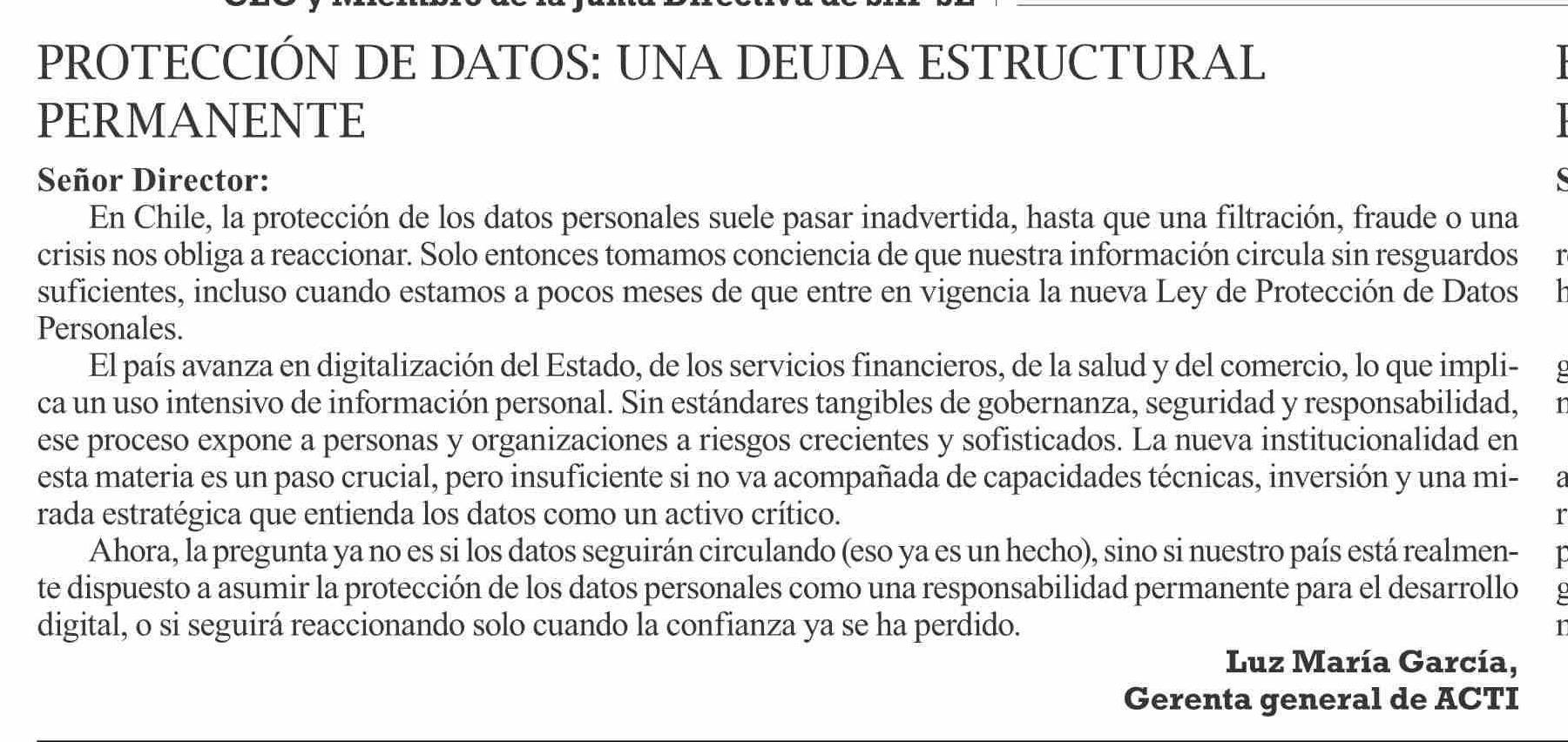 | Título: | Cartas: PROTECCIÓN DE DATOS: UNA DEUDA ESTRUCTURAL PERMANENTE |