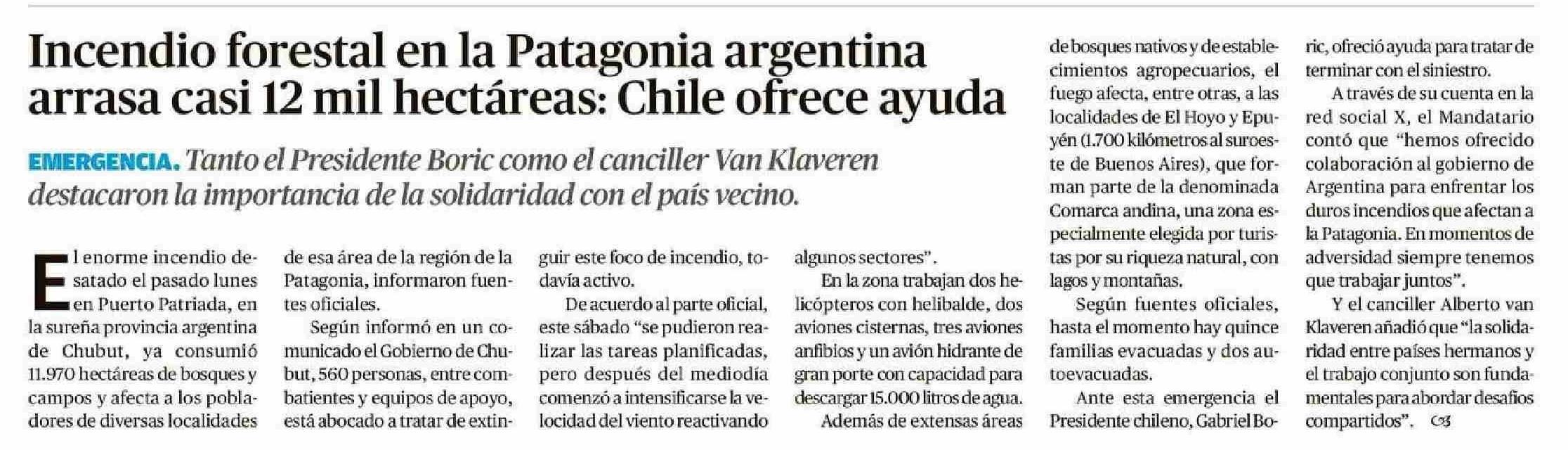 Incendio forestal en la Patagonia argentina arrasa casi 12 mil hectáreas: Chile ofrece ayuda 12-01-2026 El Llanquihue |