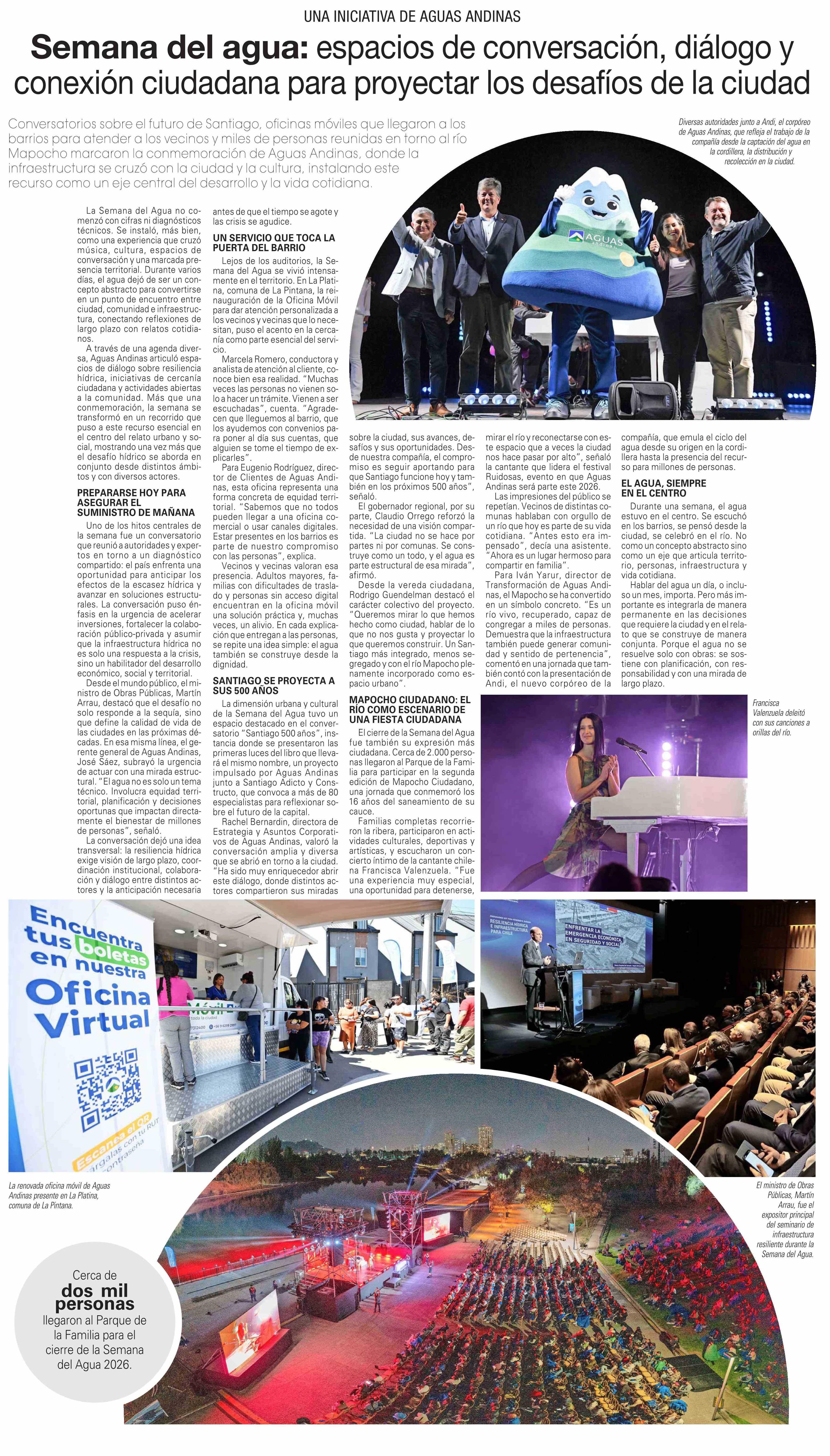 Semana del agua: espacios de conversación, diálogo y conexión ciudadana para proyectar los desafíos de la ciudad 12-04-2026 El Mercurio |