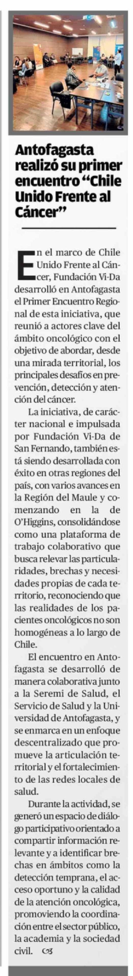 Antofagasta realizó su primer encuentro "Chile Unido Frente al Cáncer" 12-02-2026 El Mercurio de Antofagasta |