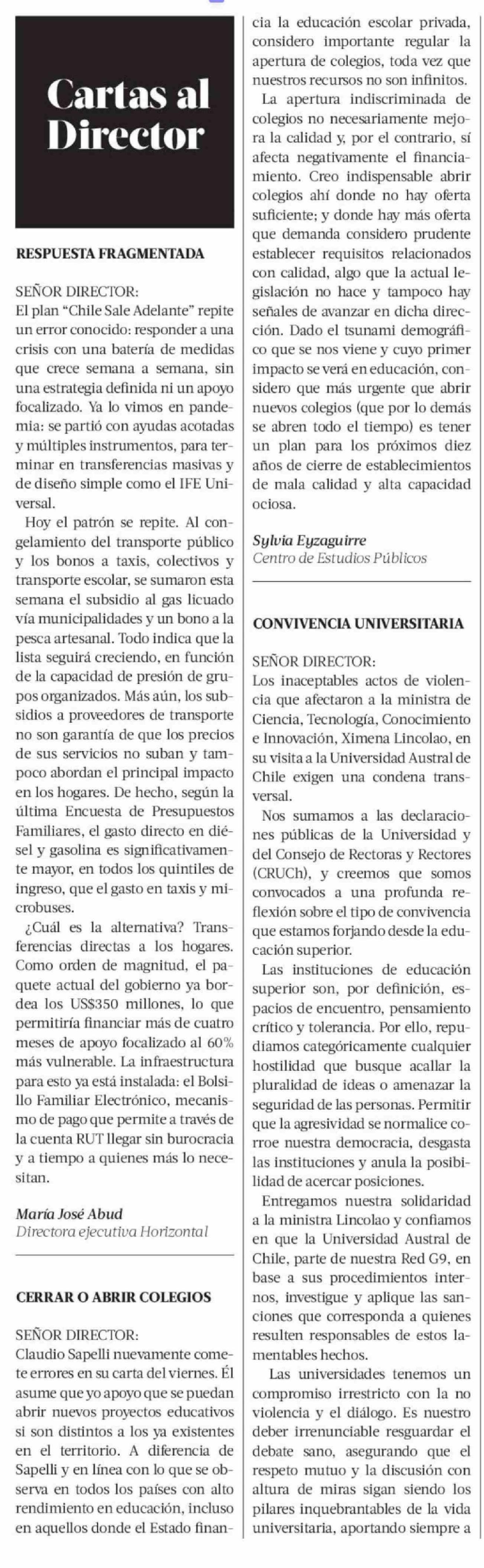 Cartas: CERRAR O ABRIR COLEGIOS 12-04-2026 La Tercera |