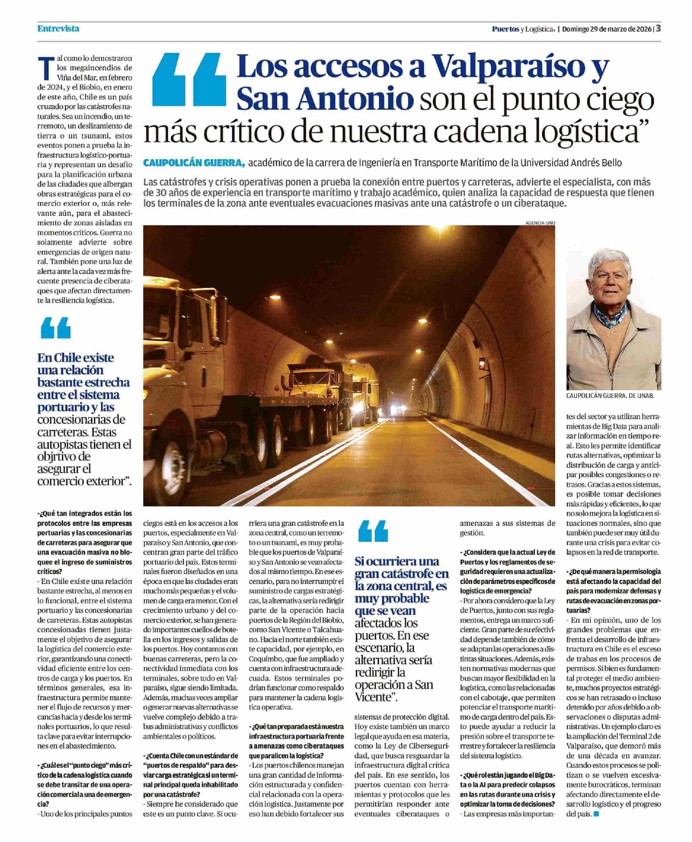 Los accesos a Valparaíso y : San Antonio son el punto ciego - más crítico de nuestra cadena logística” 29-03-2026 El Mercurio de Valparaíso |