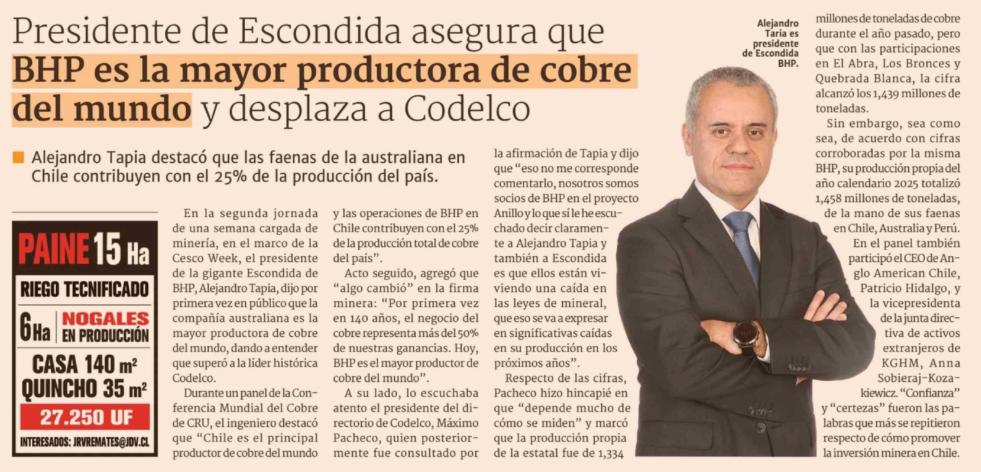 | Título: | Presidente de Escondida asegura que BHP es la mayor productora de cobre del mundo y desplaza a Codelco |