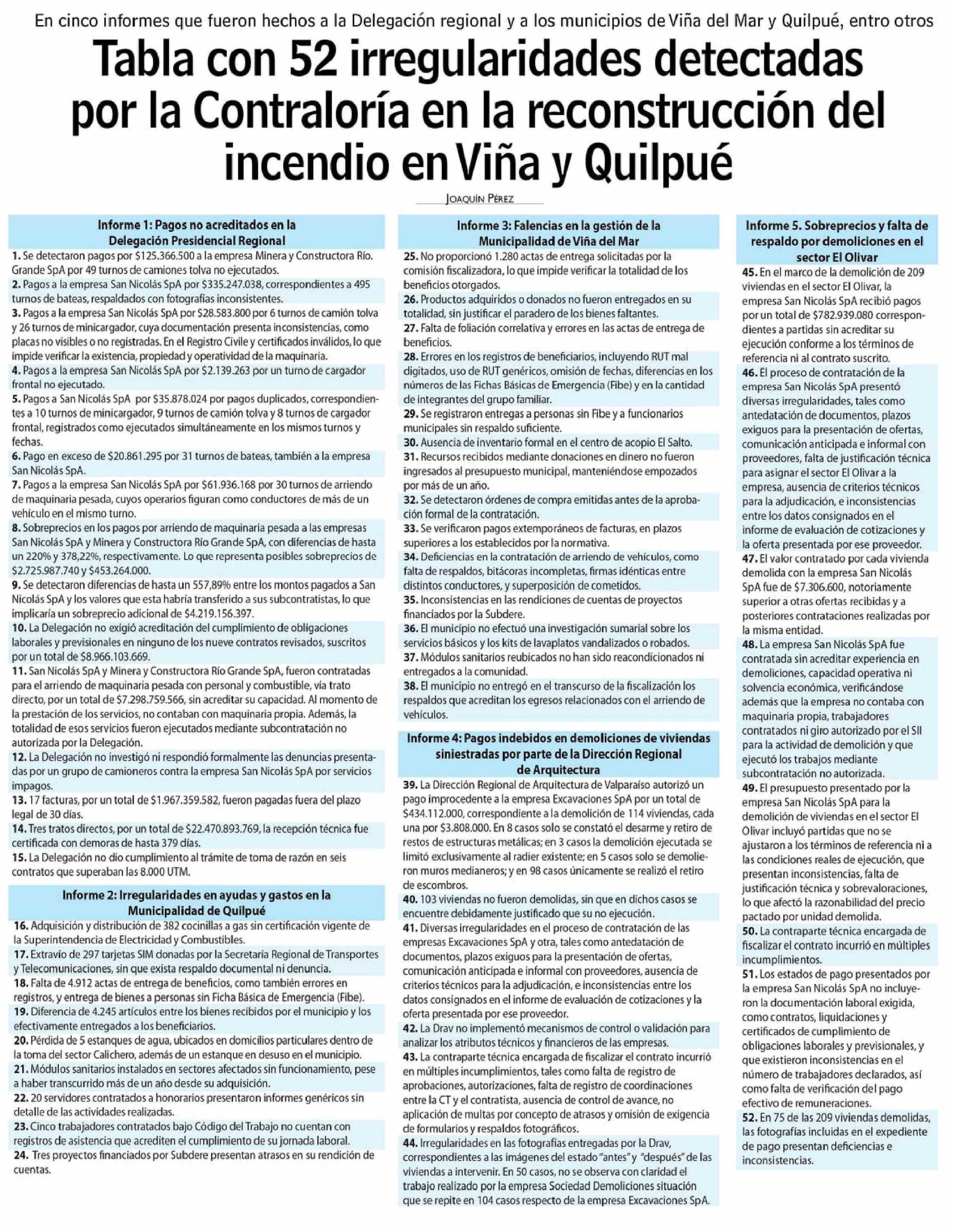 | Título: | Tabla con 52 irregularidades detectadas por la Contraloría en la reconstrucción del incendio en Viña y Quilpue |