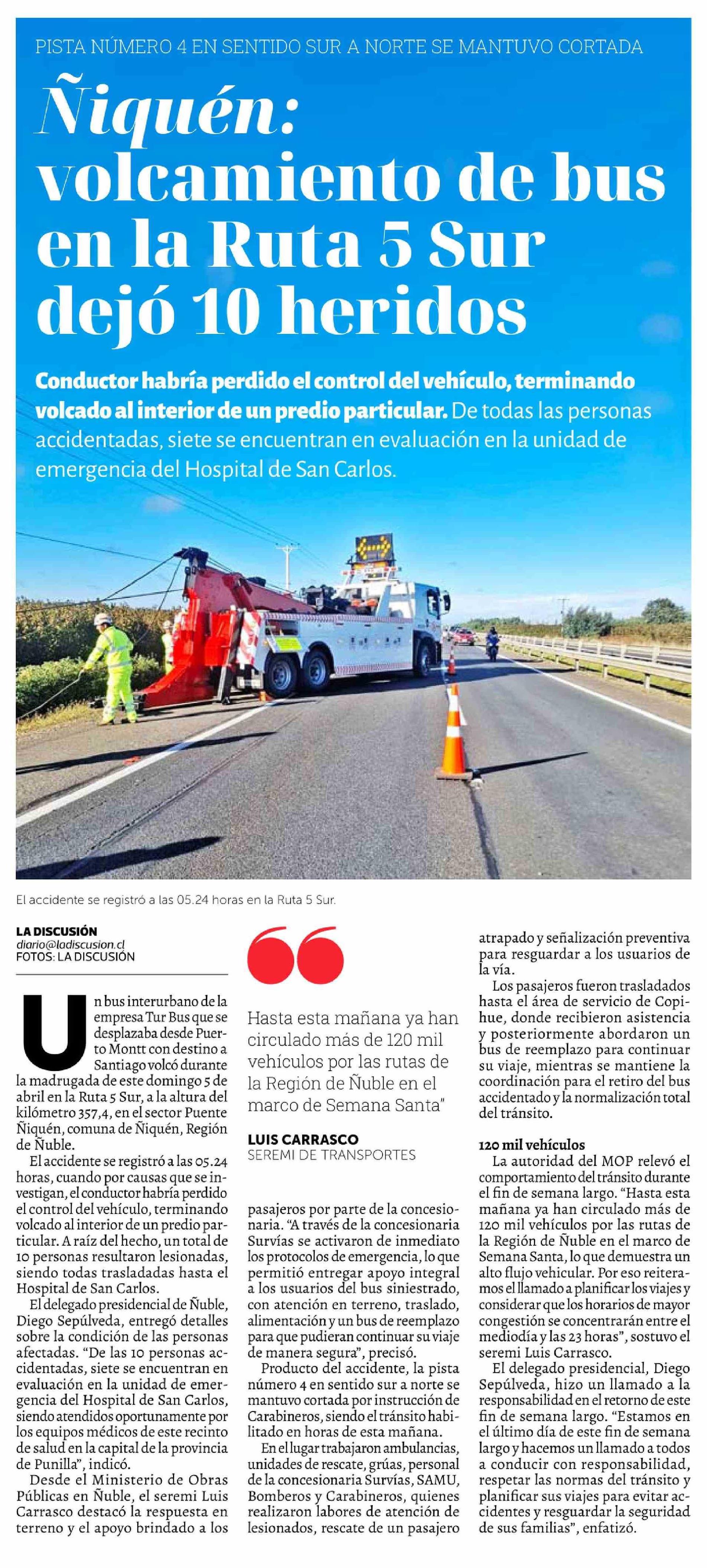 Ñiquén: volcamiento de bus en la Ruta 5 Sur dejó 10 heridos 06-04-2026 La Discusión |