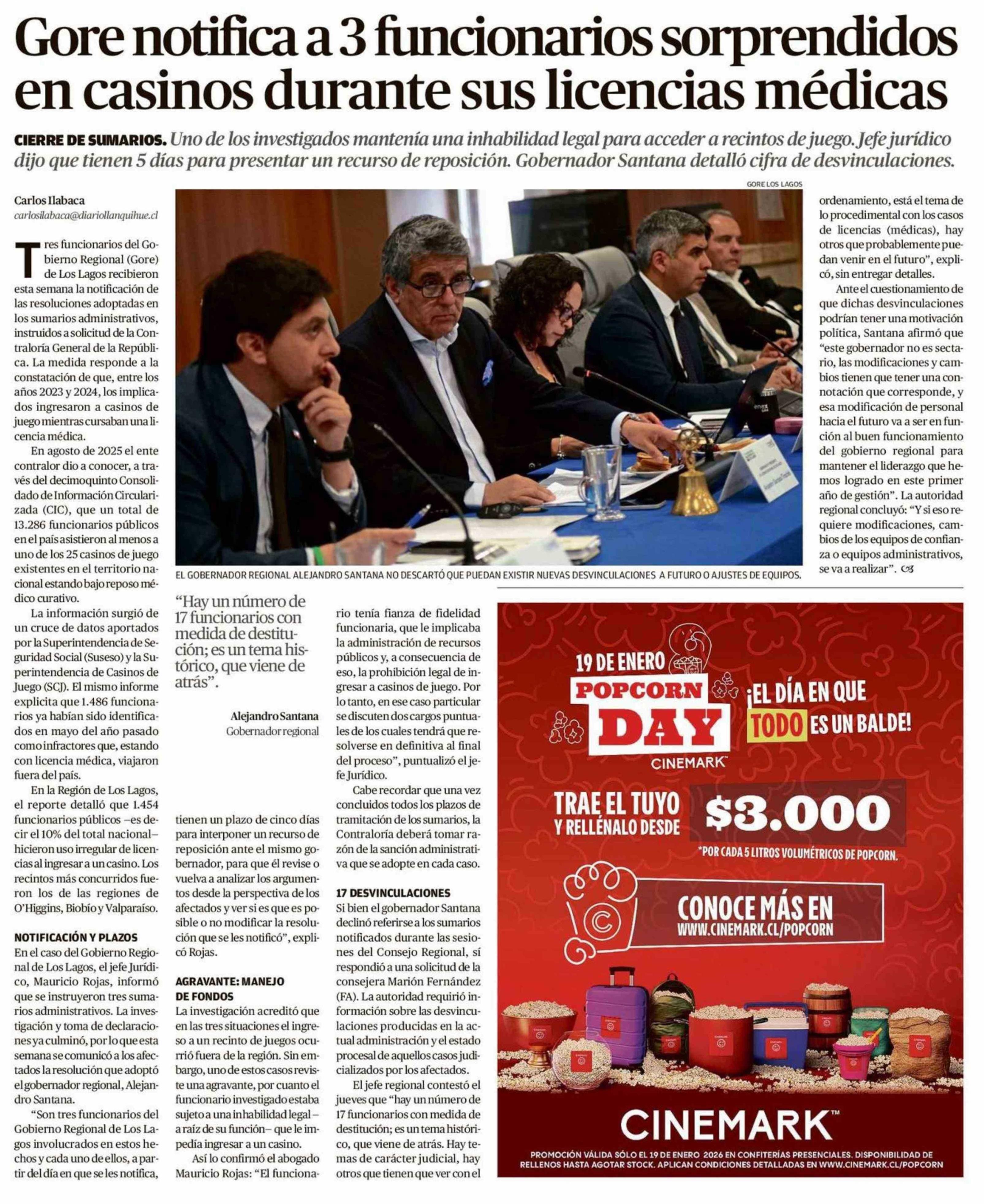 Título: Gore notifica a 3 funcionarios sorprendidos en casinos durante sus licencias médicas