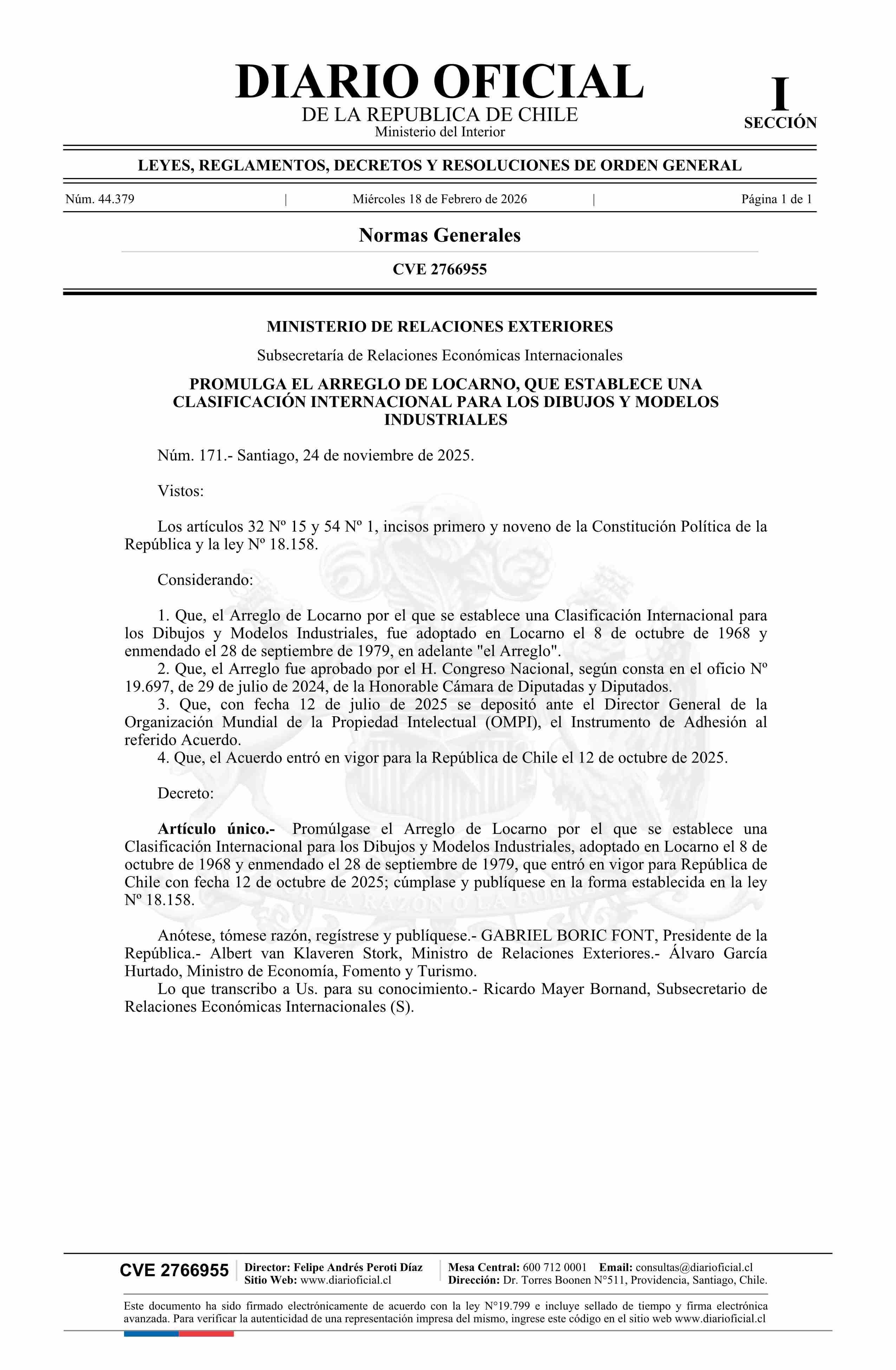 Decreto número 171, de 2025.- Promulga el Arreglo de Locarno, que establece una Clasificación Internacional para los Dibujos y Modelos Industriales