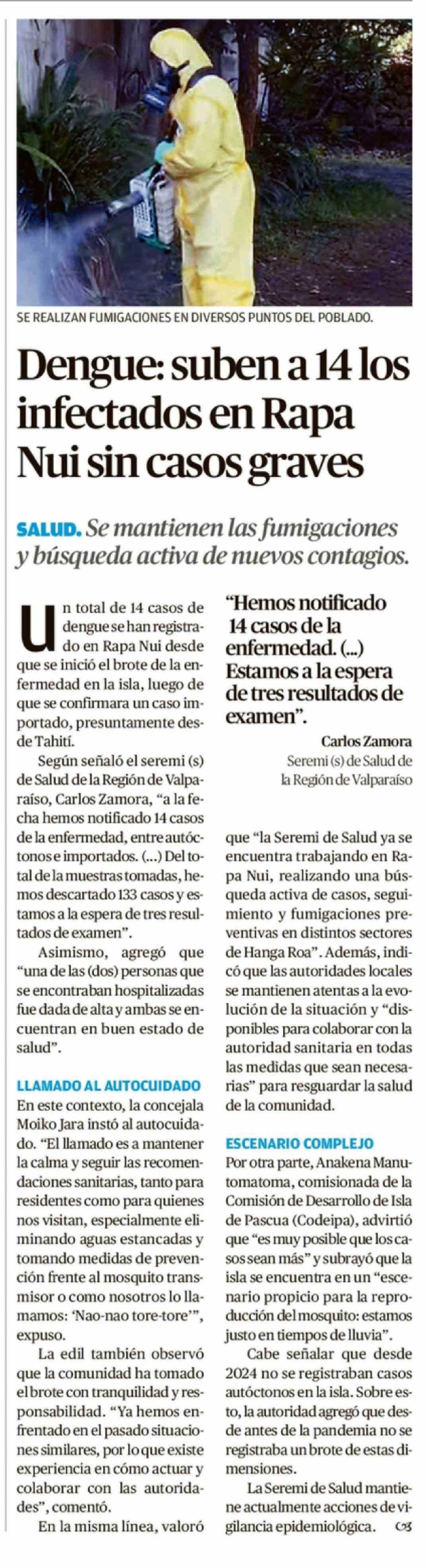 Dengue: suben a 14 los infectados en Rapa Nui sin casos graves 11-03-2026 El Mercurio de Valparaíso |