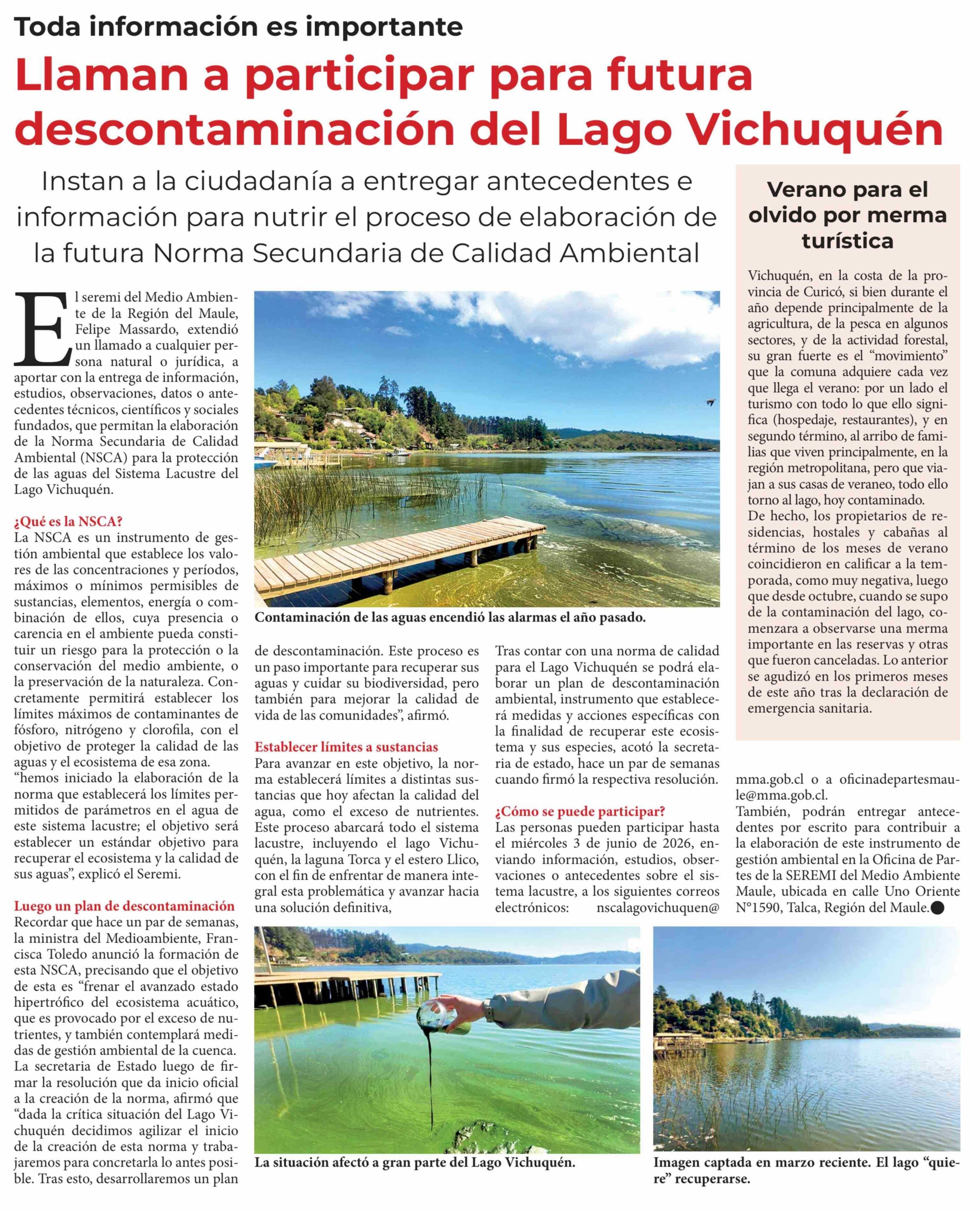 Llaman a participar para futura descontaminación del Lago Vichuquén 26-04-2026 Diario Talca |
