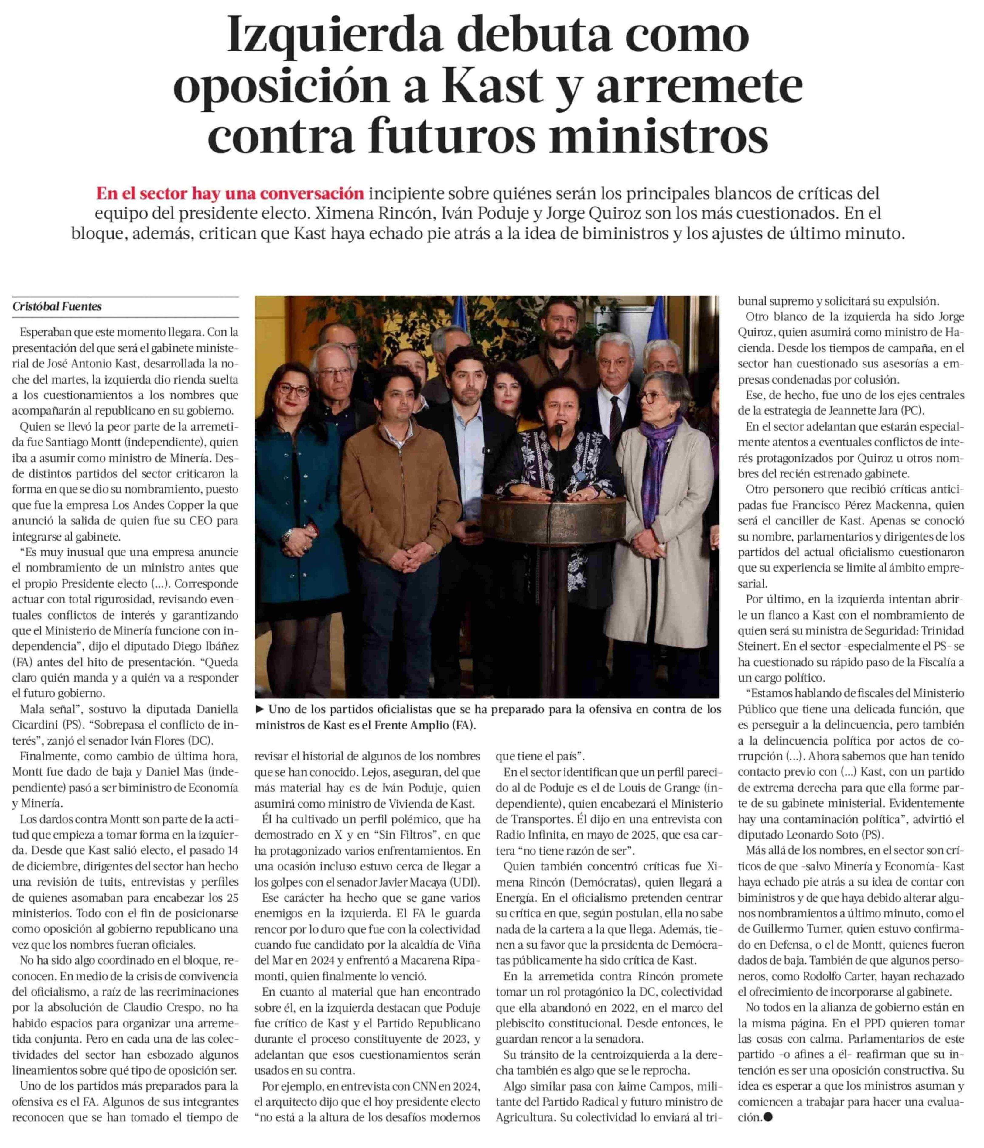 Título: Izquierda debuta como oposición a Kast y arremete contra futuros ministros