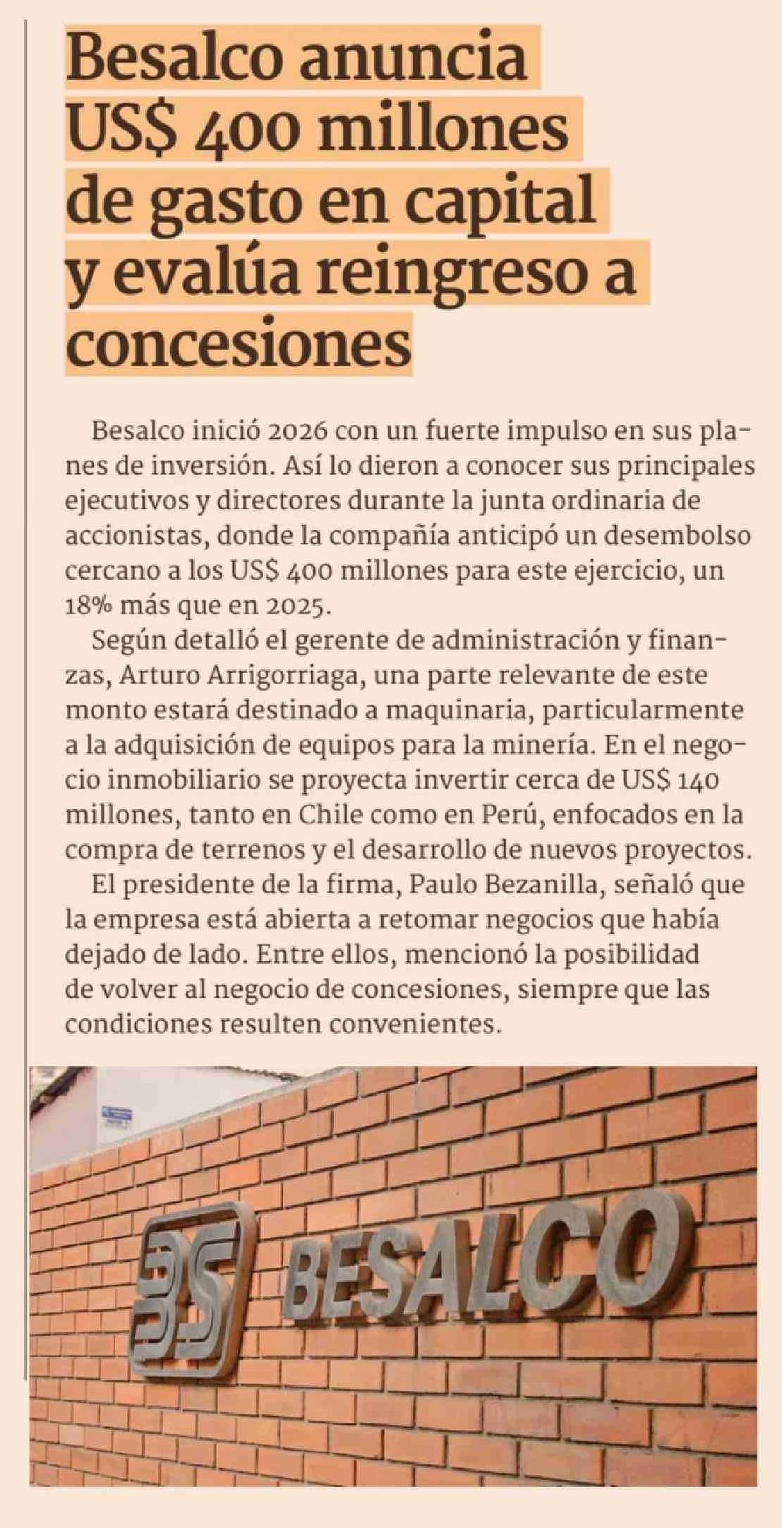 Besalco anuncia US$ 400 millones de gasto en capital y evalúa reingreso a concesiones 17-04-2026 Diario Financiero |