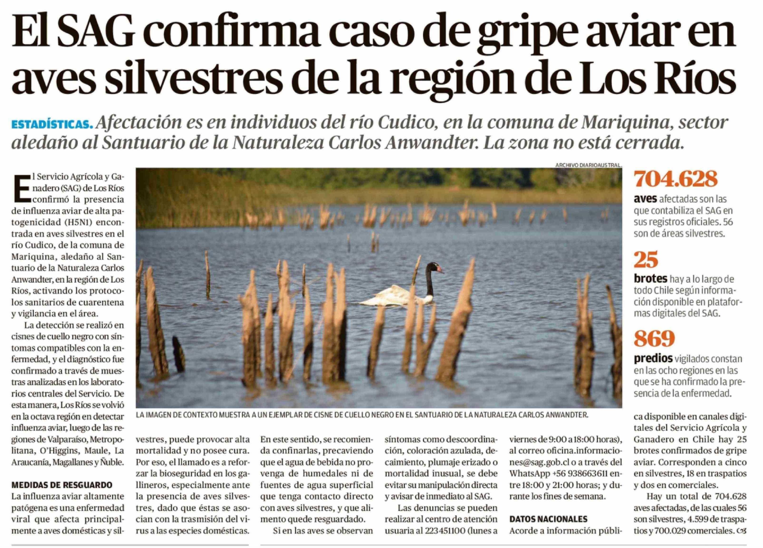 El SAG confirma caso de gripe aviar en aves silvestres de la región de Los Ríos 13-04-2026 Diario Austral Región de Los Ríos |
