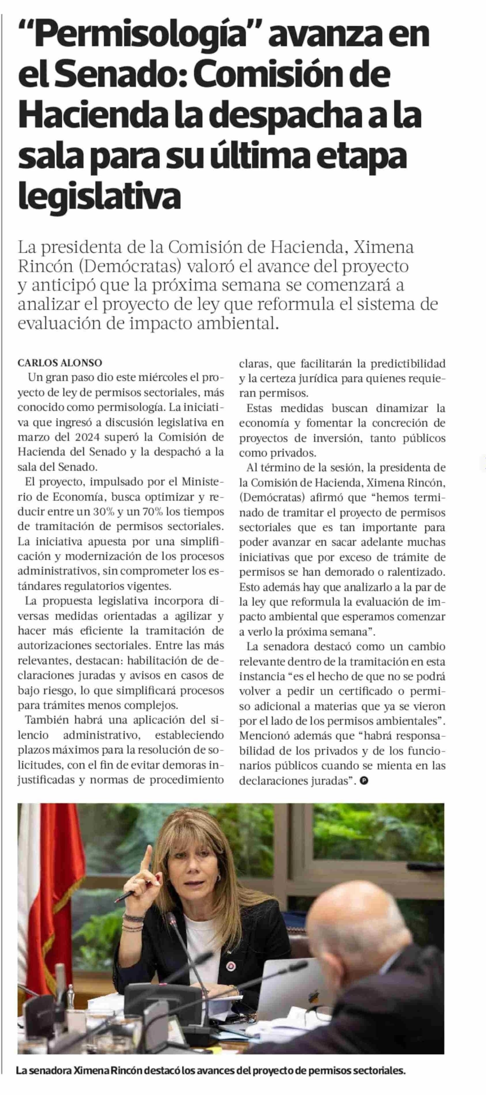 “Permisología” avanza en el Senado: Comisión de Hacienda la despacha a la sala para su última etapa legislativa 05-06-2025 La Tercera |