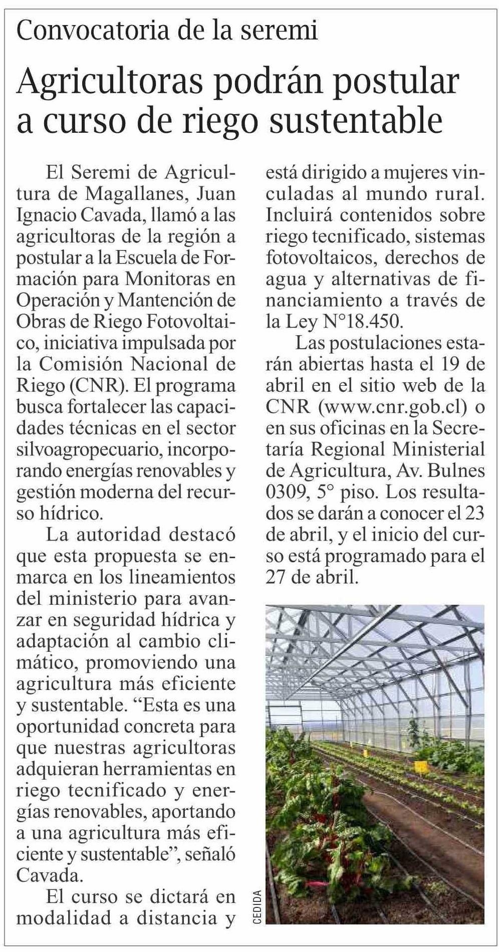 Agricultoras podrán postular a curso de riego sustentable 04-04-2026 El Pingüino |