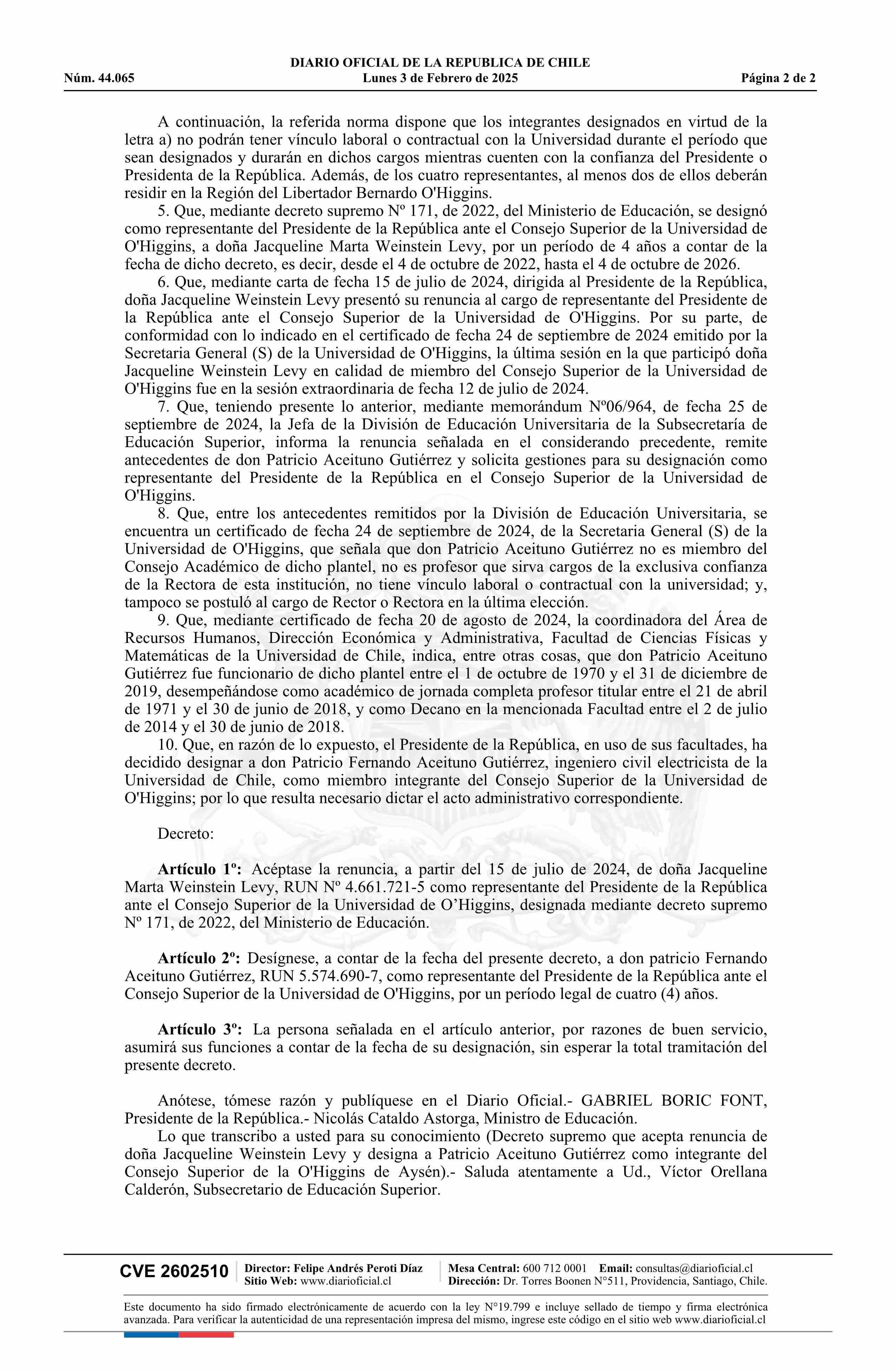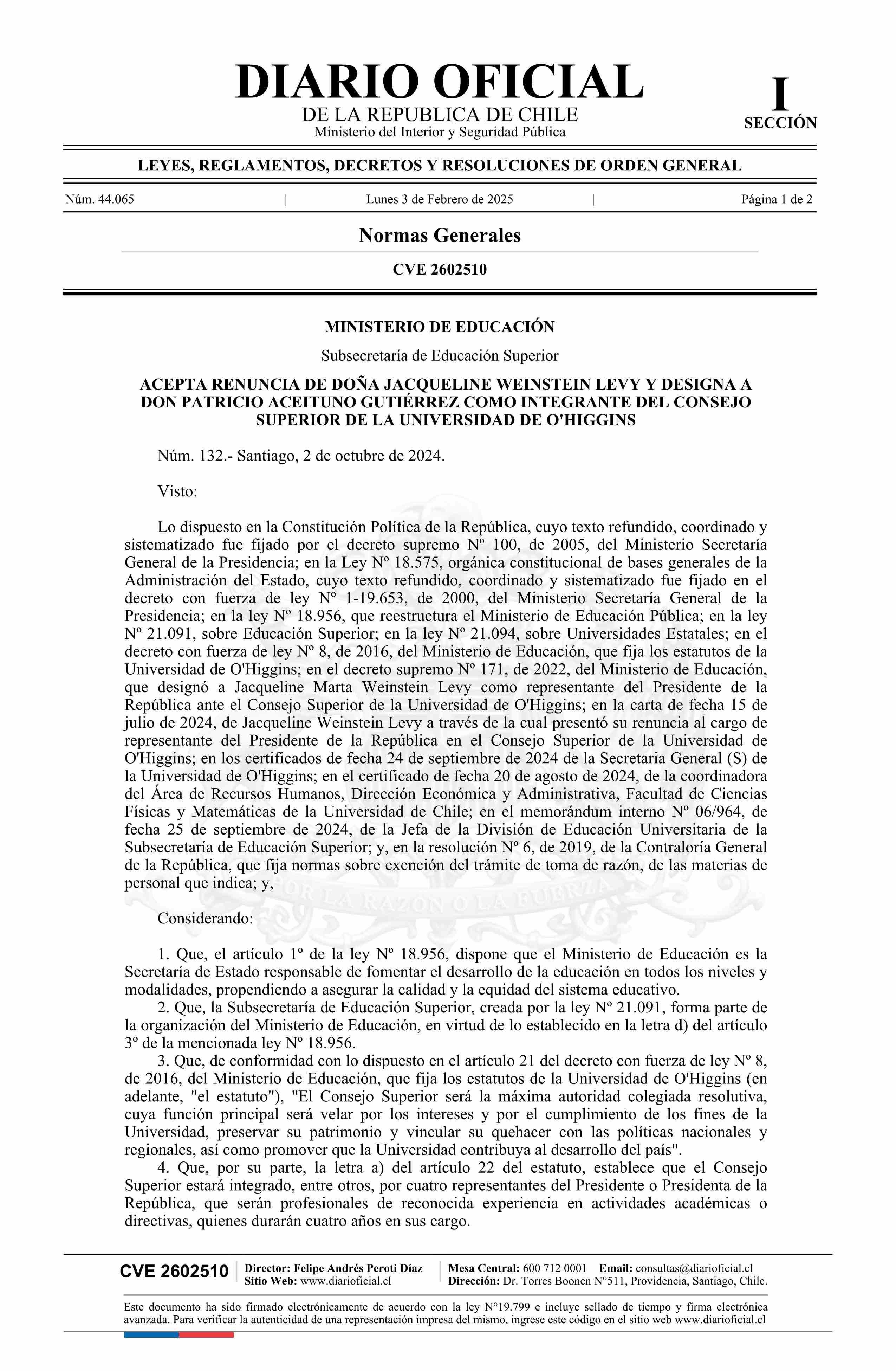 | Título: | Decreto número 132, de 2024.- Acepta renuncia de doña Jacqueline Weinstein Levy y designa a don Patricio Aceituno Gutiérrez como integrante del Consejo Superior de la Universidad de O'Higgins |