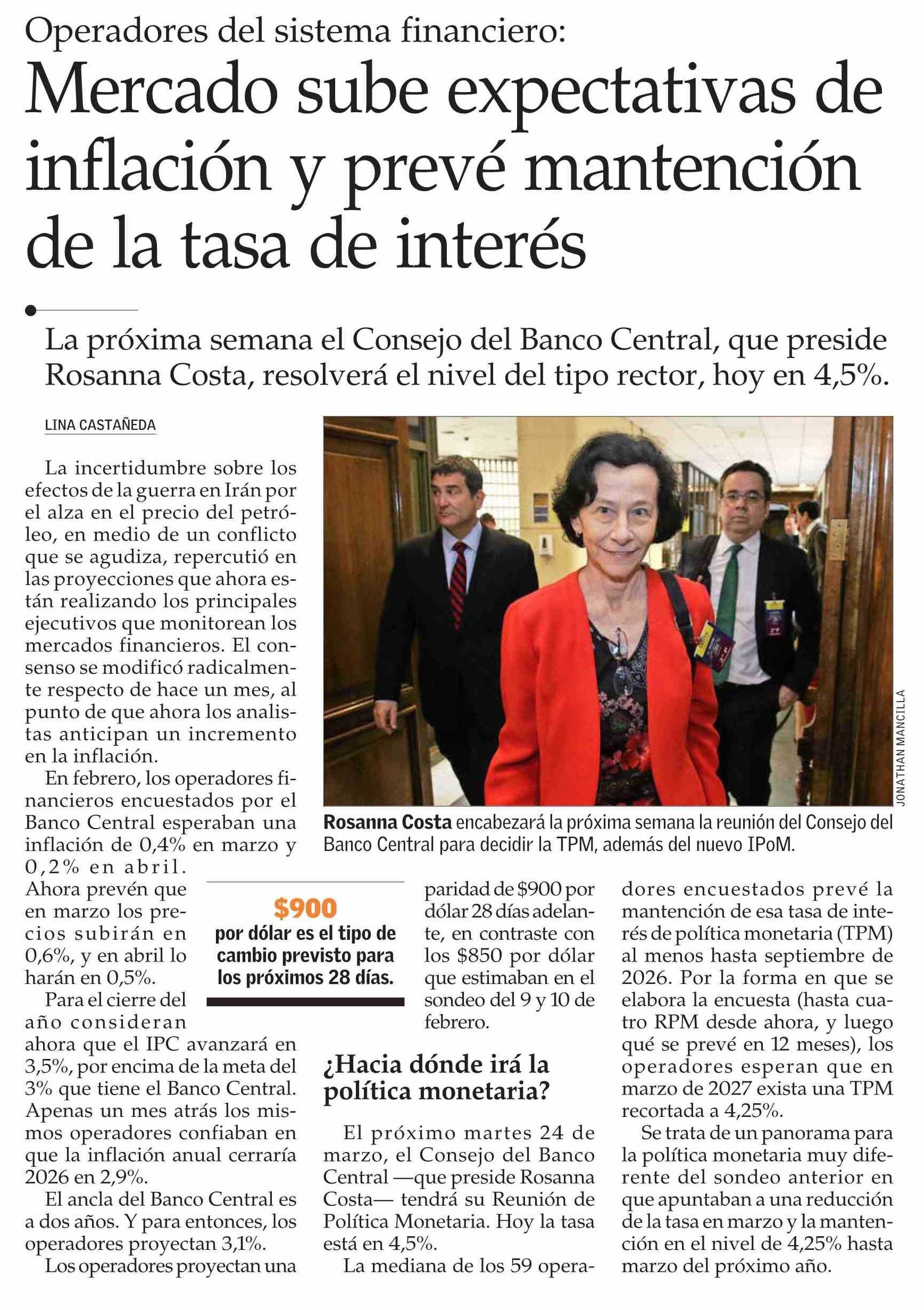 Mercado sube expectativas de inflación y prevé mantención de la tasa de interés 20-03-2026 El Mercurio |