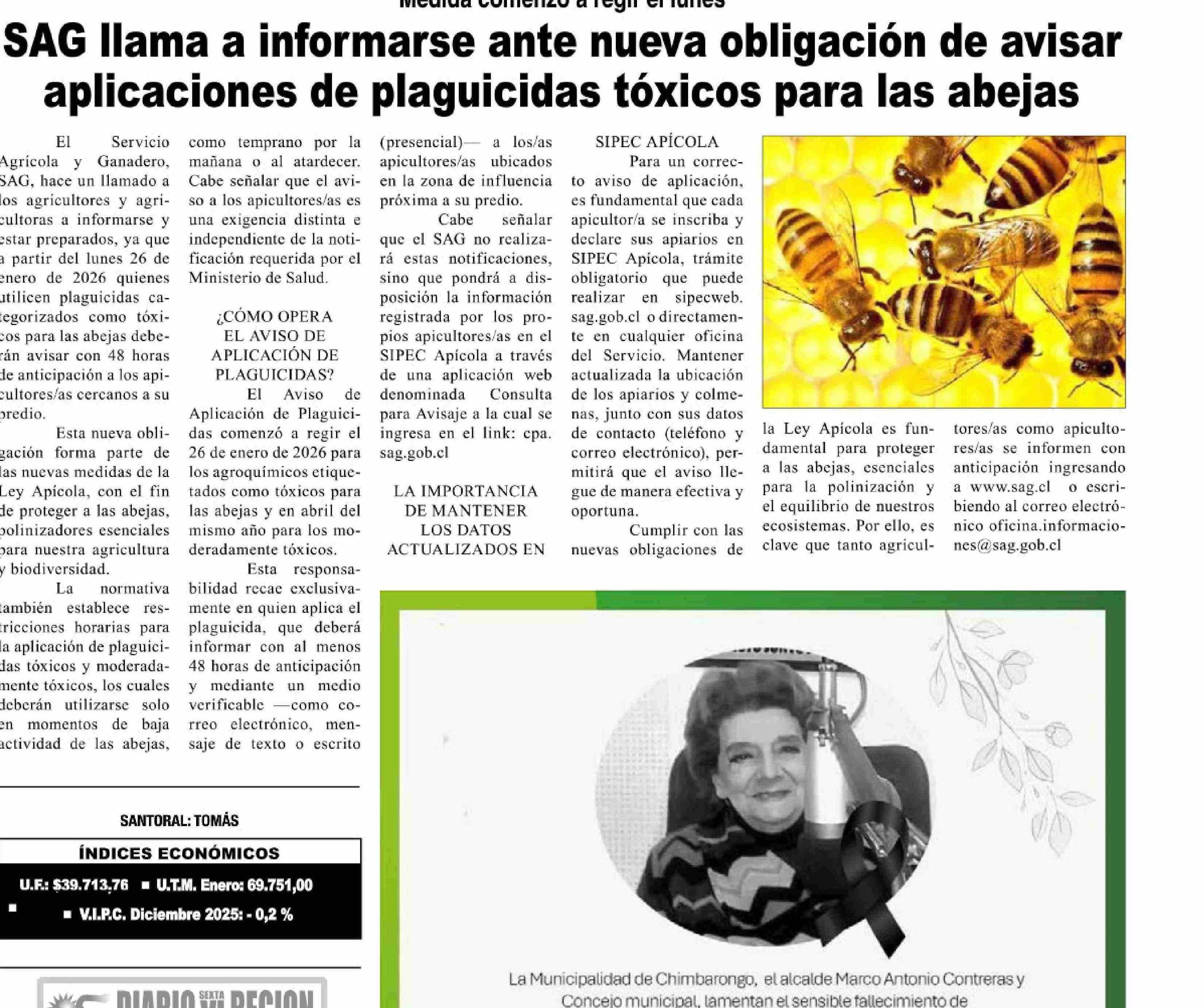 Título: SAG llama a informarse ante nueva obligación de avisar aplicaciones de plaguicidas tóxicos para las abejas
