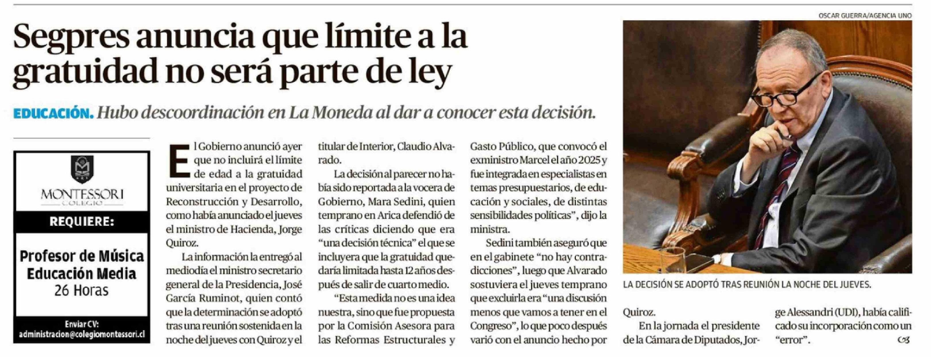 Segpres anuncia que límite a la gratuidad no será parte de ley 18-04-2026 El Austral de la Araucanía |