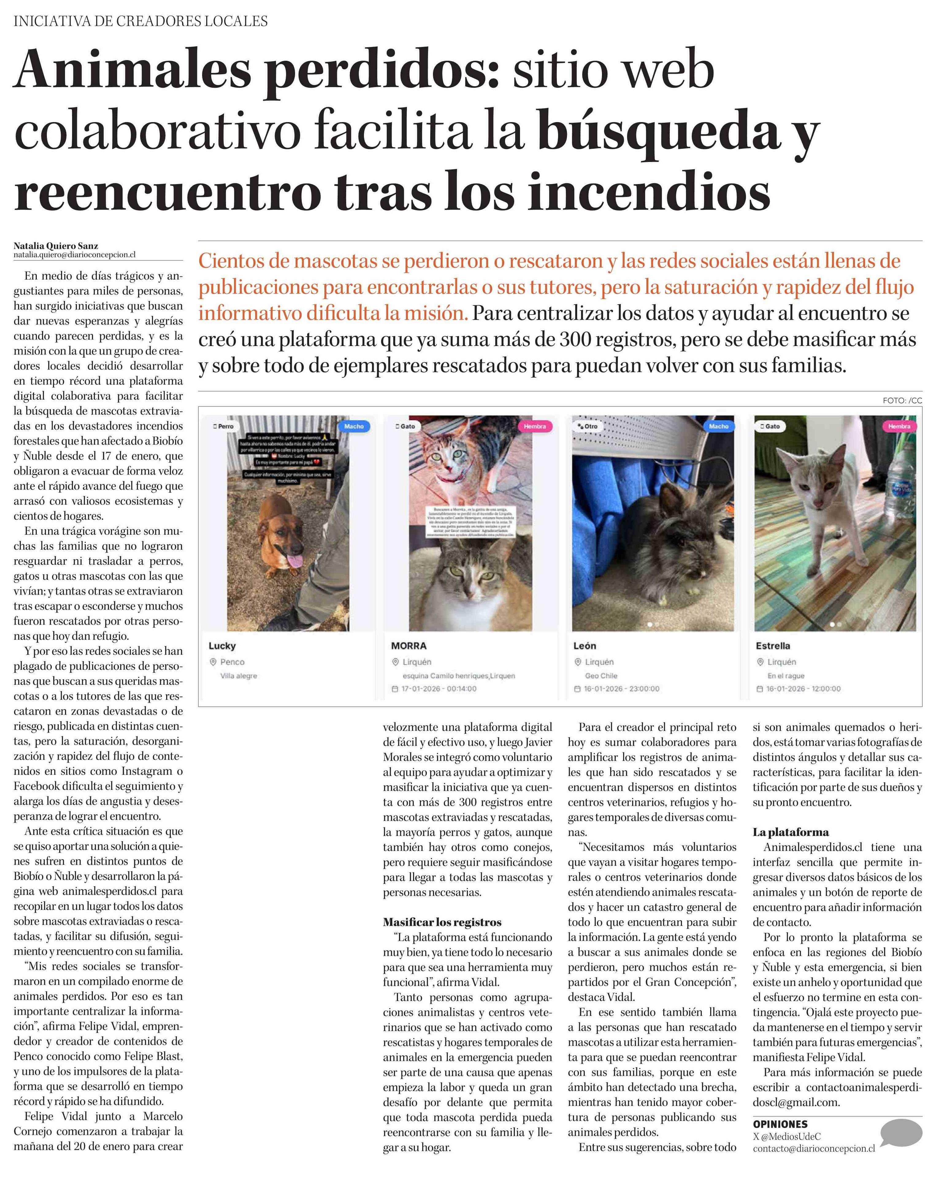 Animales perdidos: sitio web colaborativo facilita la búsqueda y reencuentro tras los incendios 23-01-2026 Diario Concepción |