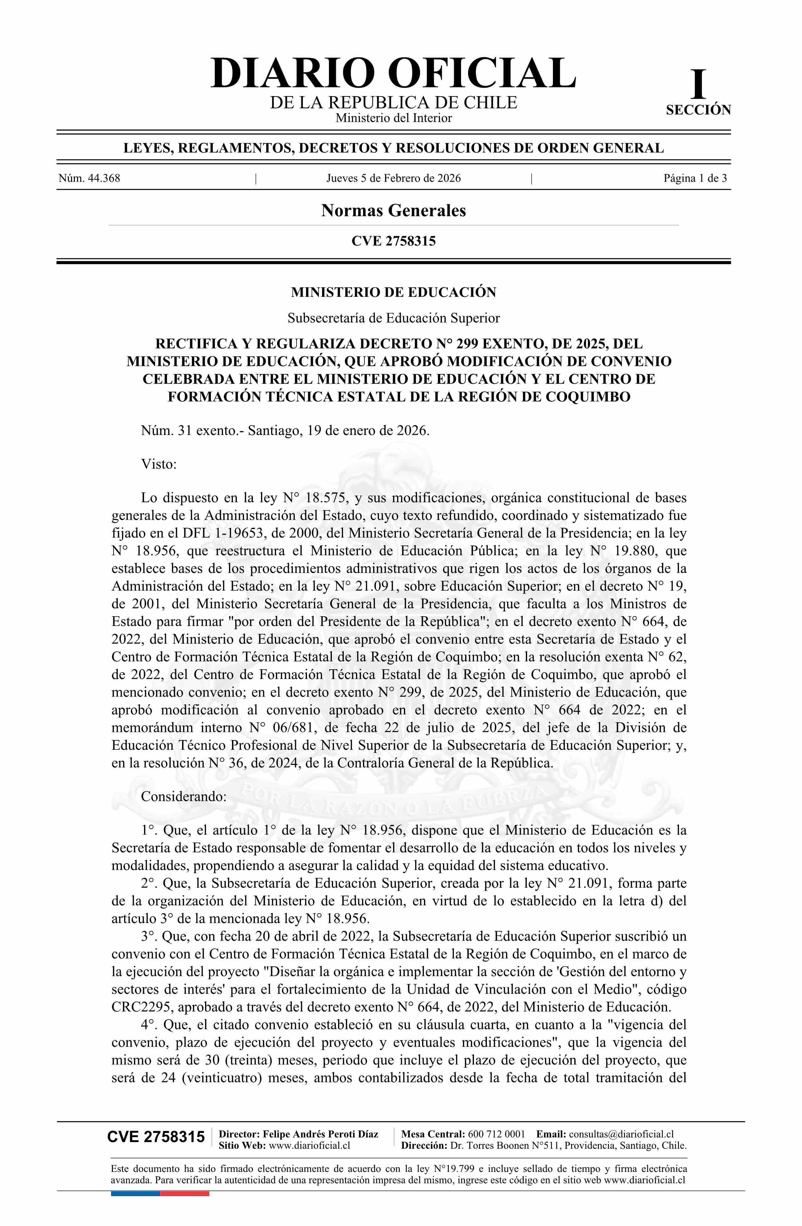 Título: Decreto exento número 31, de 2026.- Rectifica y regulariza decreto N° 299 exento, de 2025, que aprobó modificación de convenio celebrada entre el Ministerio de Educación y el Centro de Formación Técnica Estatal de la Región de Coquimbo