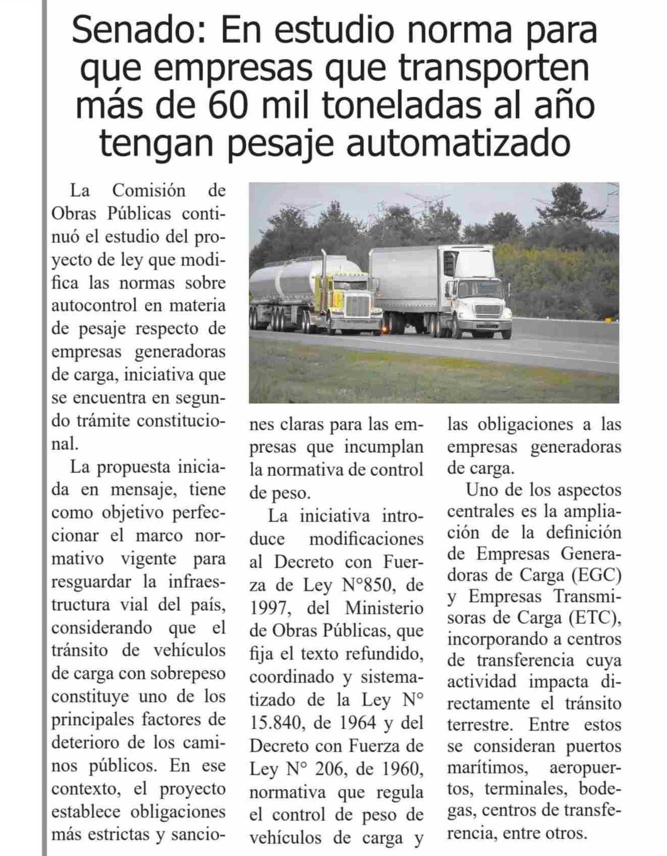 Título: Senado: En estudio norma para que empresas que transporten más de 60 mil toneladas al año tengan pesaje automatizado