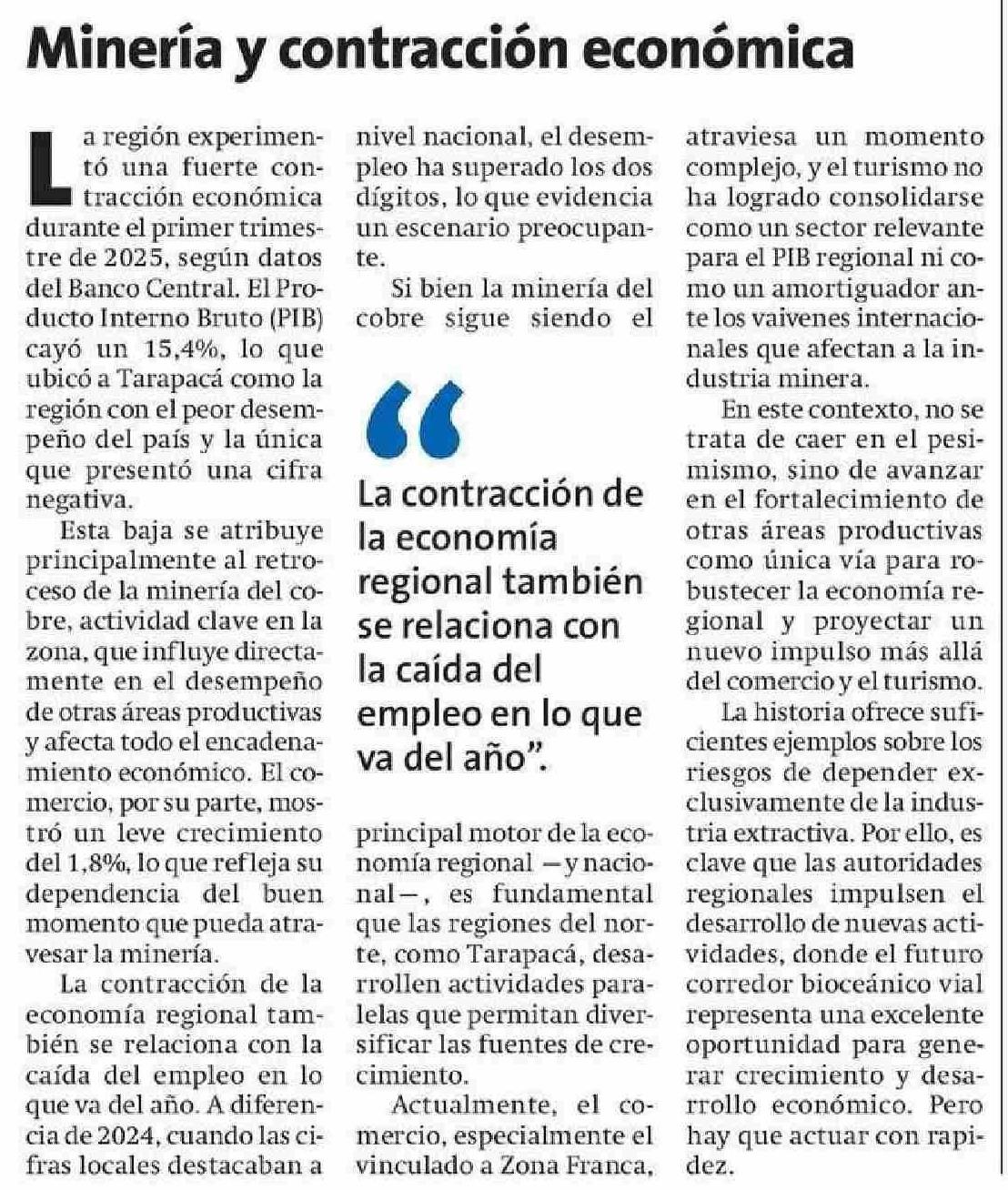 Minería y contracción económica 26-06-2025 La Estrella de Iquique |