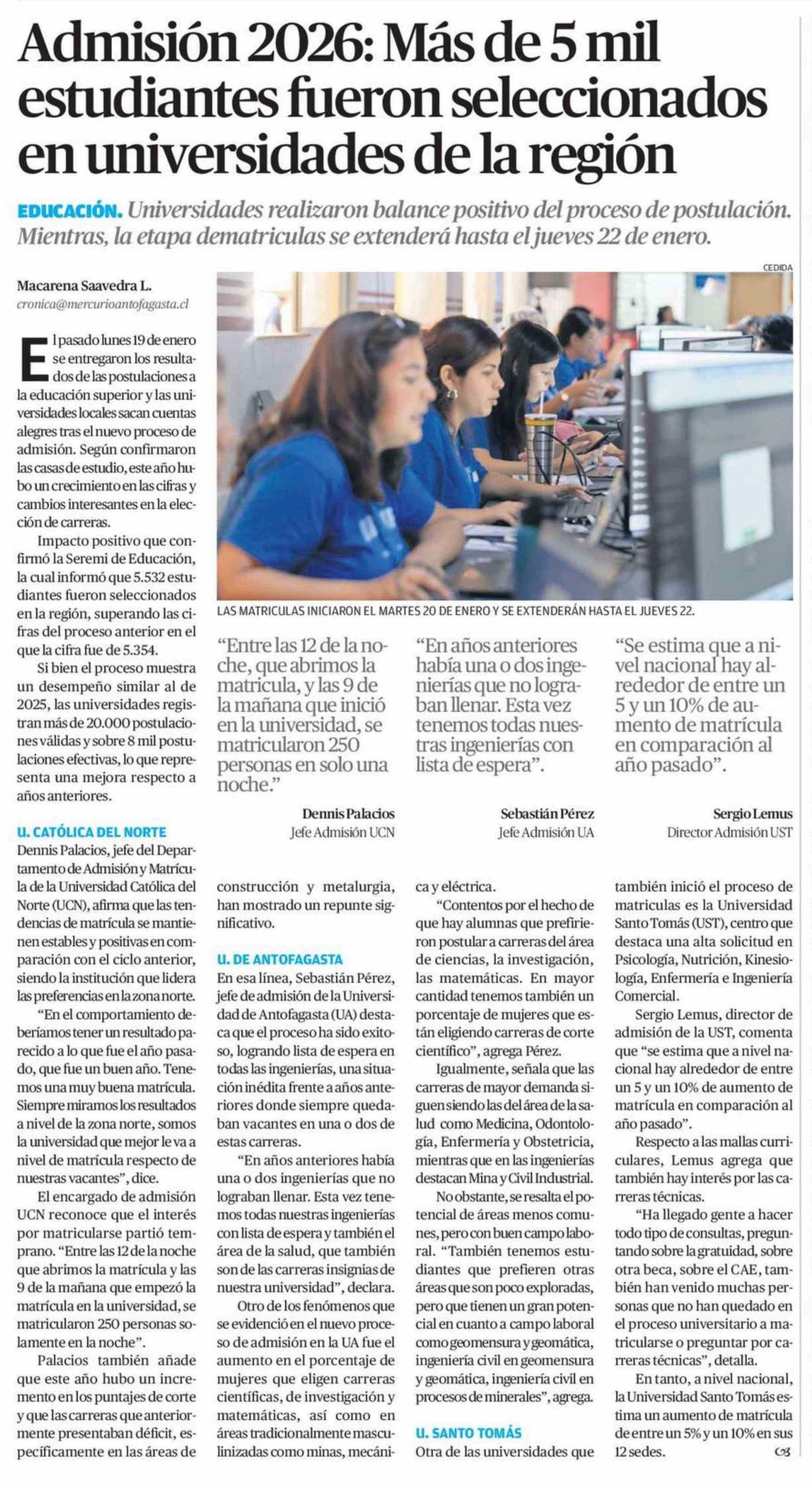 Admisión 2026: Más de 5 mil estudiantes fueron seleccionados en universidades de la región 21-01-2026 El Mercurio de Antofagasta |