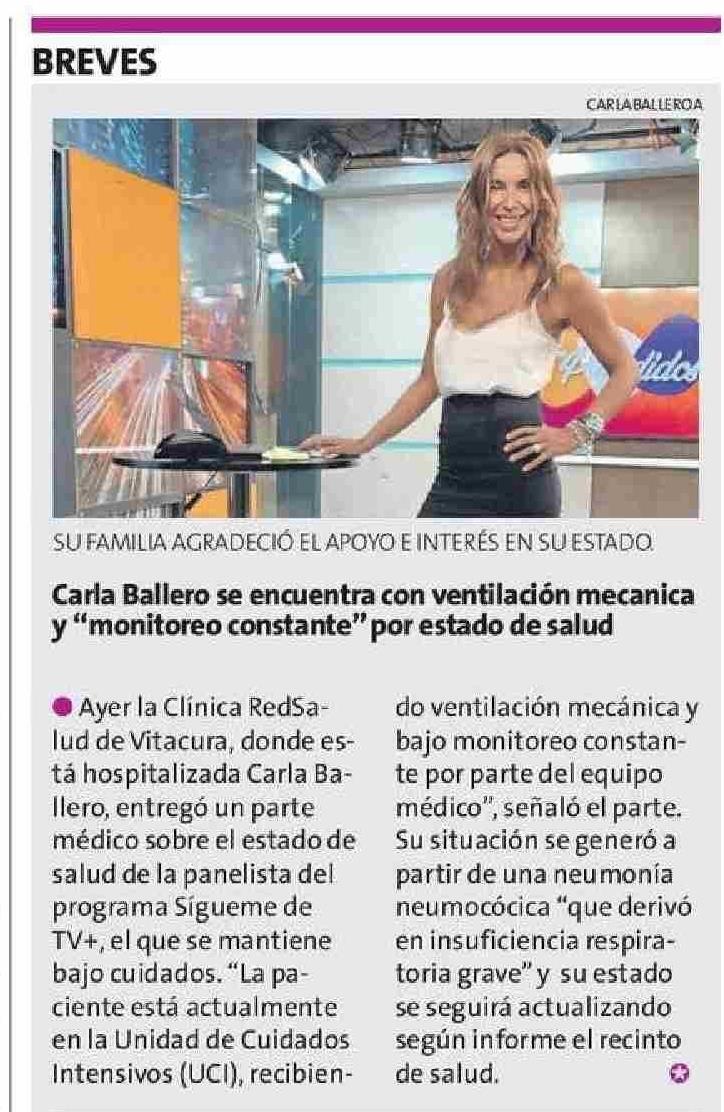 Carla Ballero se encuentra con ventilación mecanica y “monitoreo constante” por estado de salud 17-05-2025 La Estrella de Iquique |